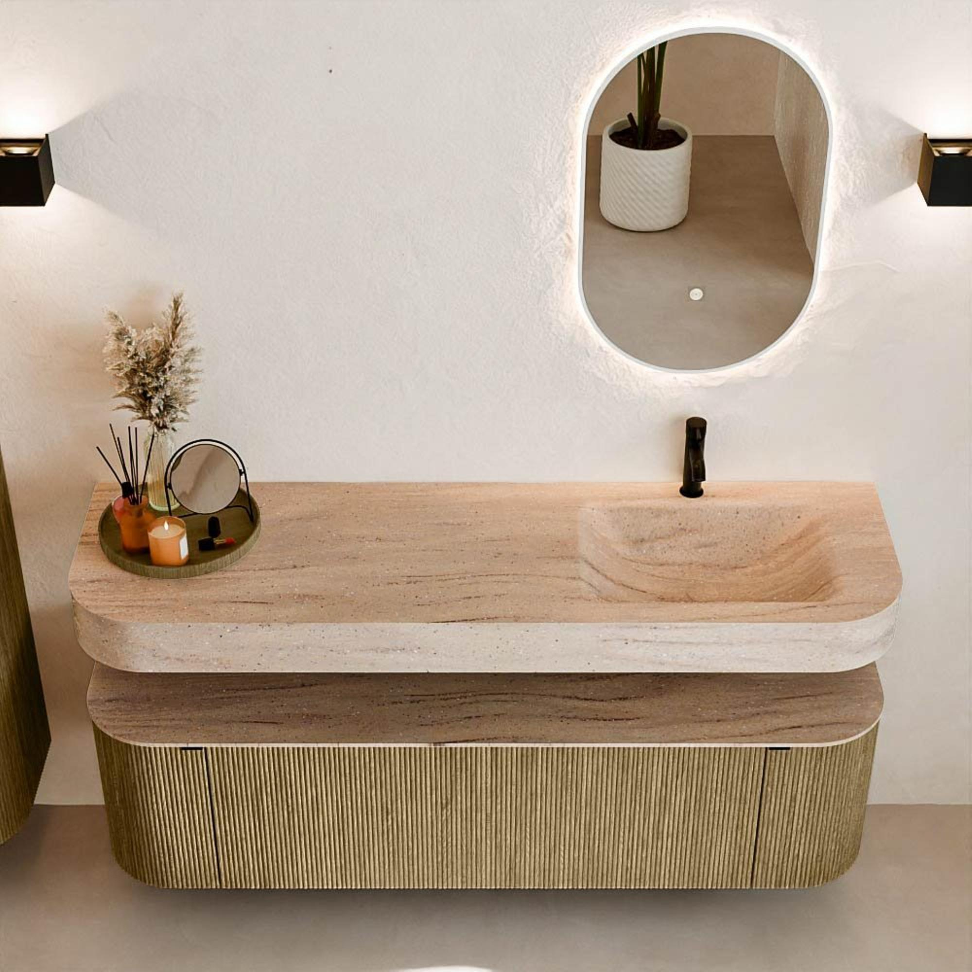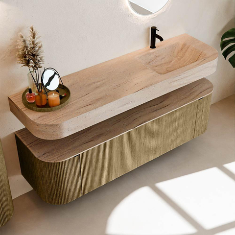 Matériaux naturels dans des tons chauds. Les nervures verticales apportent rythme et texture au design, tandis que le chêne confère une apparence chaleureuse et artisanale. Choisissez parmi 5 teintes de bois OAK, WALNUT, DUSK, SHADOW et RUBY, des couleurs de bois soigneusement sélectionnées pour enrichir les salles de bains modernes et classiques.