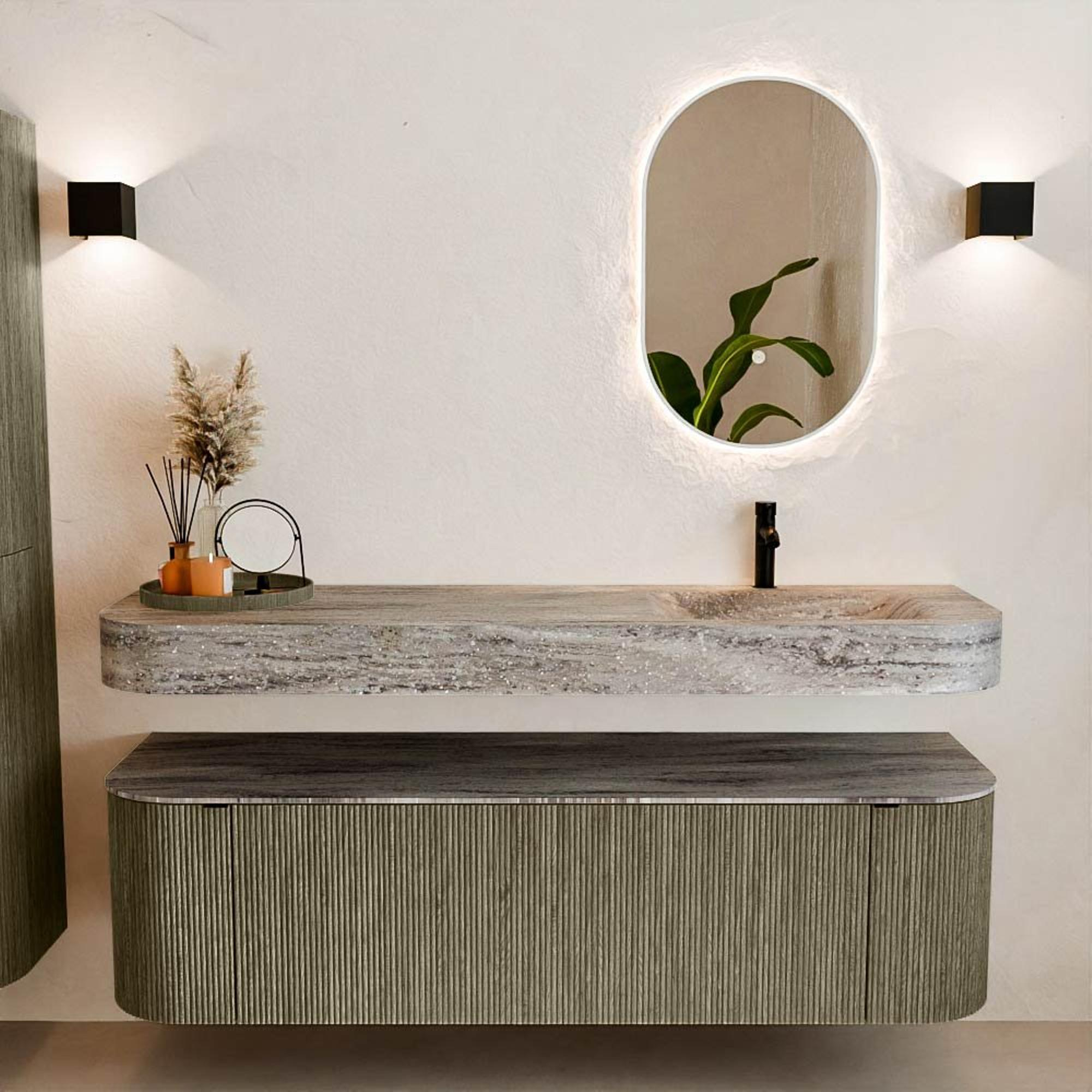 Matériaux naturels dans des tons chauds. Les nervures verticales apportent rythme et texture au design, tandis que le chêne confère une apparence chaleureuse et artisanale. Choisissez parmi 5 teintes de bois OAK, WALNUT, DUSK, SHADOW et RUBY, des couleurs de bois soigneusement sélectionnées pour enrichir les salles de bains modernes et classiques.