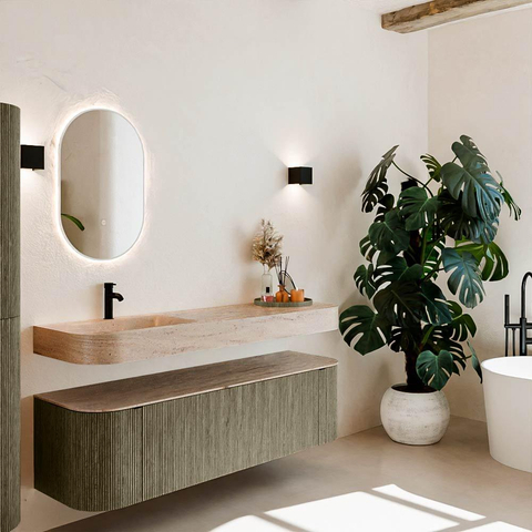 Matériaux naturels dans des tons chauds. Les nervures verticales apportent rythme et texture au design, tandis que le chêne confère une apparence chaleureuse et artisanale. Choisissez parmi 5 teintes de bois OAK, WALNUT, DUSK, SHADOW et RUBY, des couleurs de bois soigneusement sélectionnées pour enrichir les salles de bains modernes et classiques.