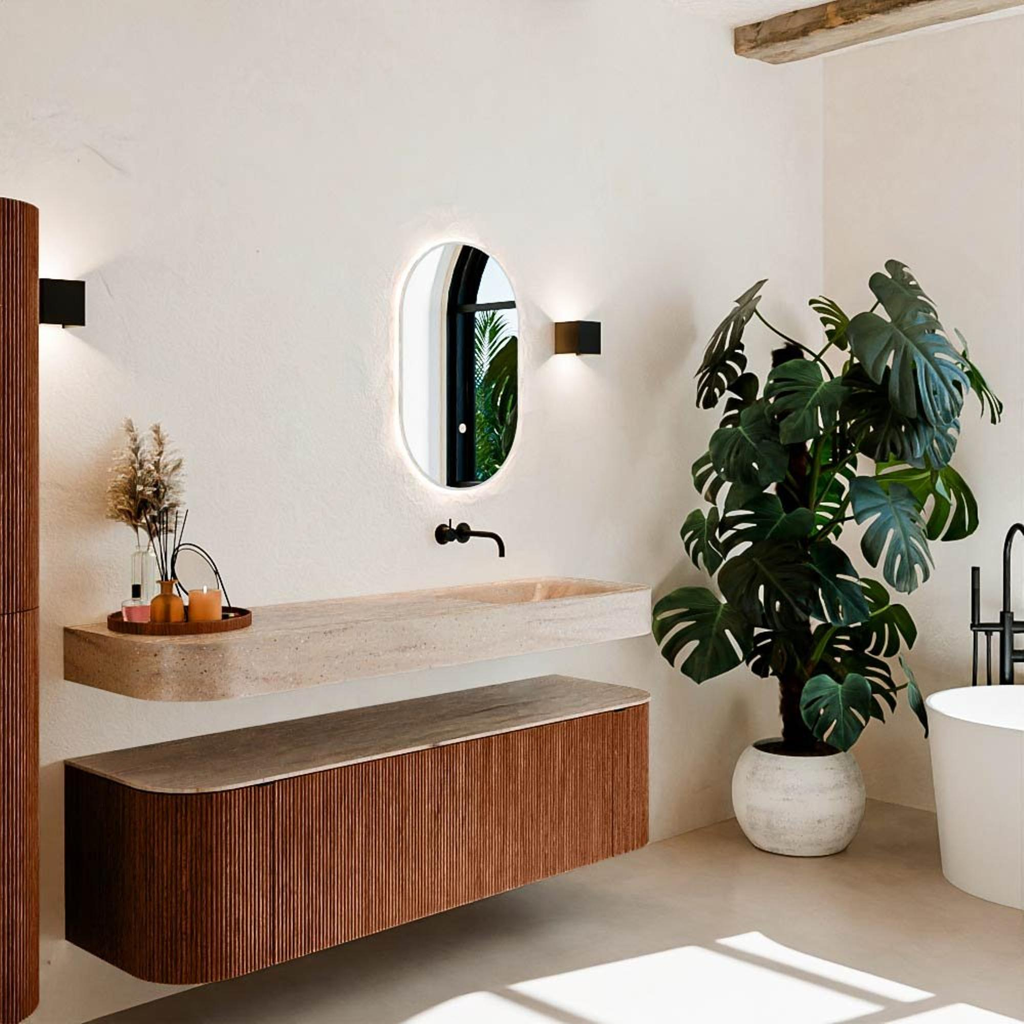 Matériaux naturels dans des tons chauds. Les reliefs verticaux apportent rythme et texture au design, tandis que le chêne confère une apparence chaleureuse et artisanale. Choisissez parmi 5 teintes de bois OAK, WALNUT, DUSK, SHADOW et RUBY, des couleurs de bois soigneusement sélectionnées pour enrichir les salles de bains modernes et classiques.