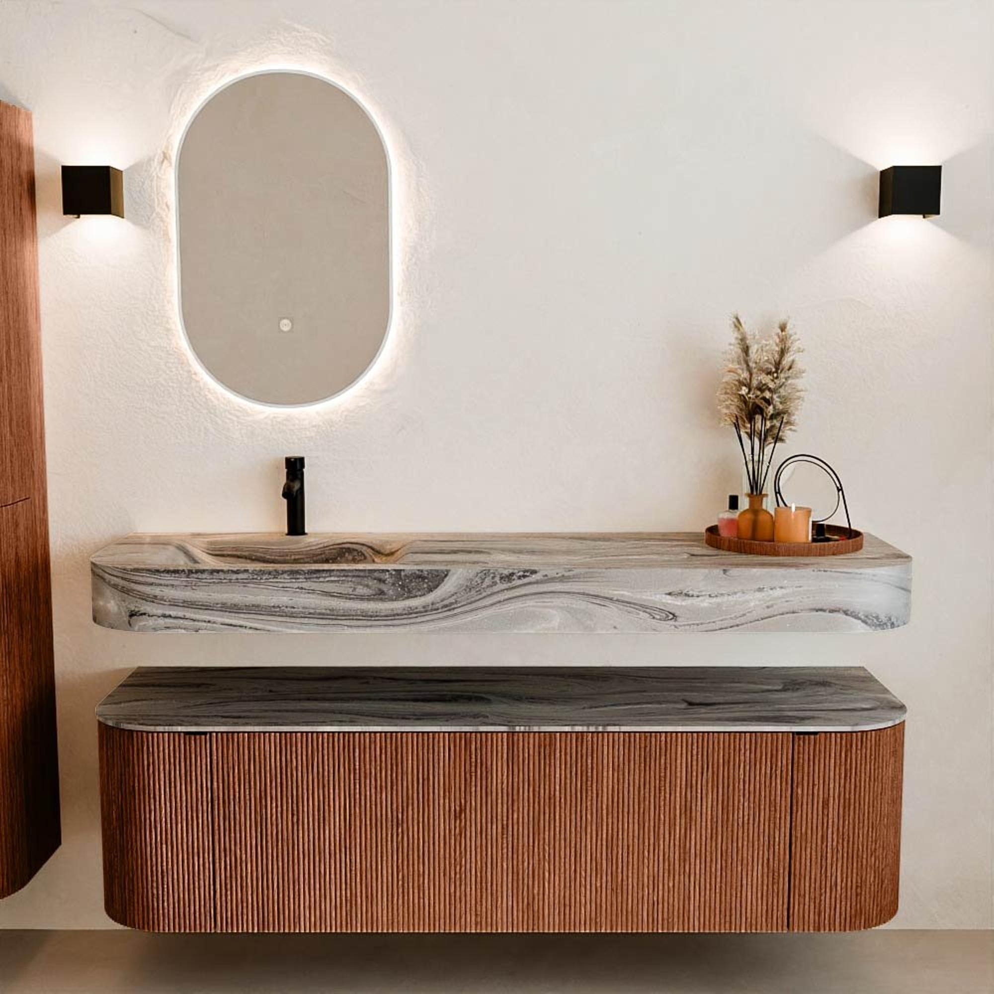 Matériaux naturels dans des tons chauds. Les cannelures verticales apportent rythme et texture au design, tandis que le chêne confère une apparence chaleureuse et artisanale. Choisissez parmi 5 teintes de bois OAK, WALNUT, DUSK, SHADOW et RUBY, des couleurs de bois soigneusement sélectionnées pour enrichir les salles de bains modernes et classiques.