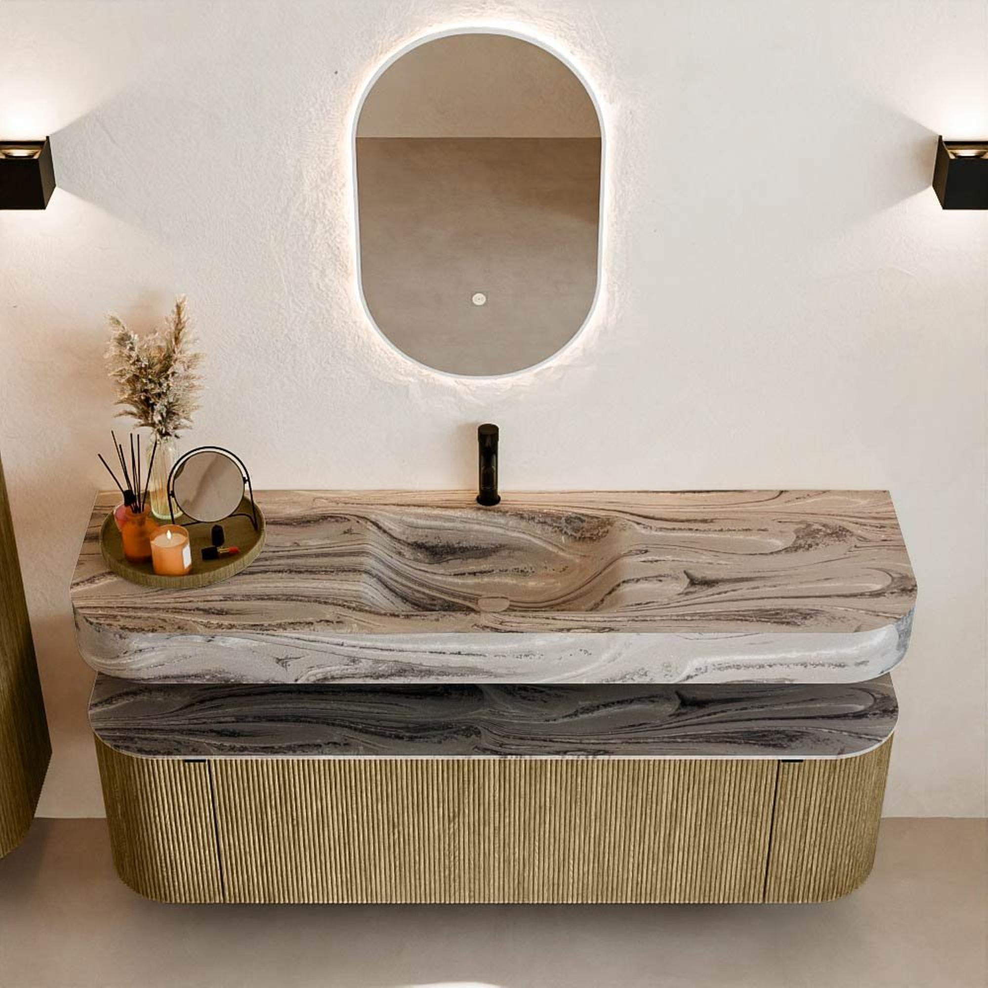 Matériaux naturels aux teintes chaudes. Les nervures verticales apportent rythme et texture au design, tandis que le chêne confère une apparence chaleureuse et artisanale. Choisissez parmi 5 teintes de bois OAK, WALNUT, DUSK, SHADOW et RUBY, des couleurs de bois soigneusement sélectionnées pour enrichir les salles de bains modernes et classiques.