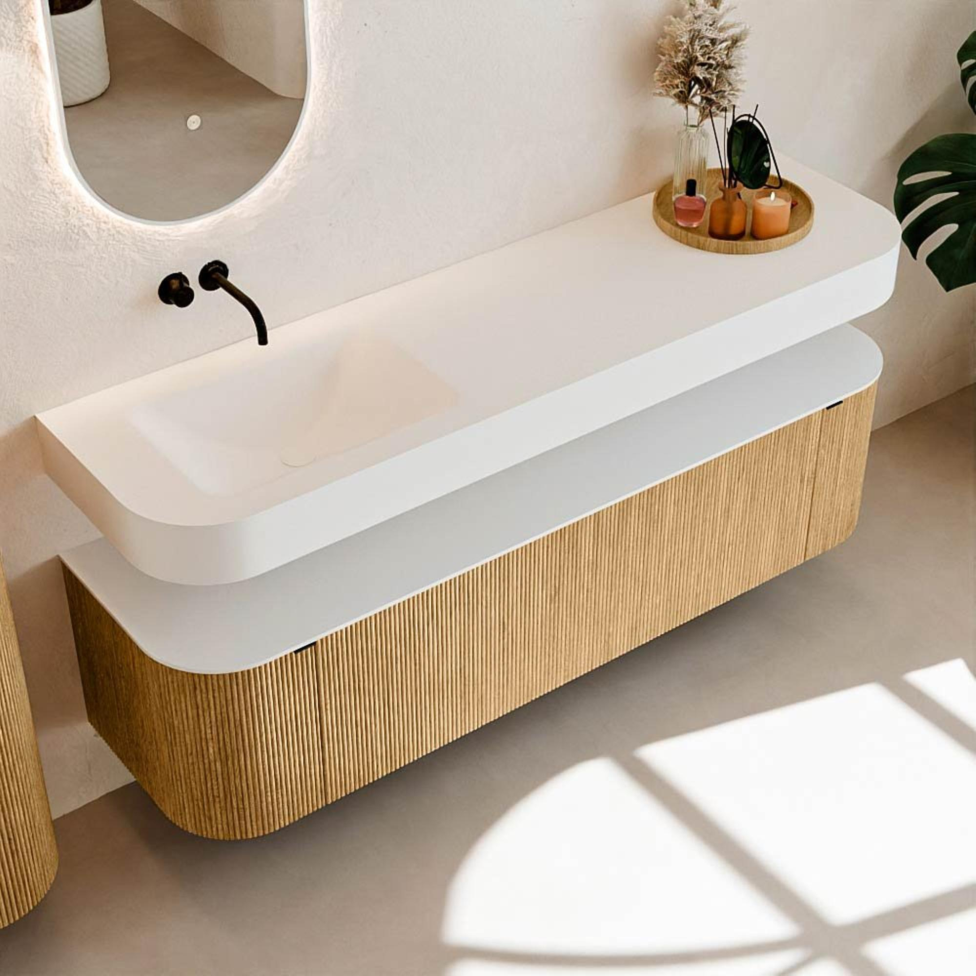 Au-dessus du meuble flotte une vasque suspendue assortie aux coins arrondis – parfaitement adaptée à la forme du meuble. La vasque est réalisée en Solid Surface et suit subtilement les lignes du meuble inférieur, créant un ensemble harmonieux. Le plan de travail en Solid Surface constitue une base solide et facile d'entretien et complète la combinaison.