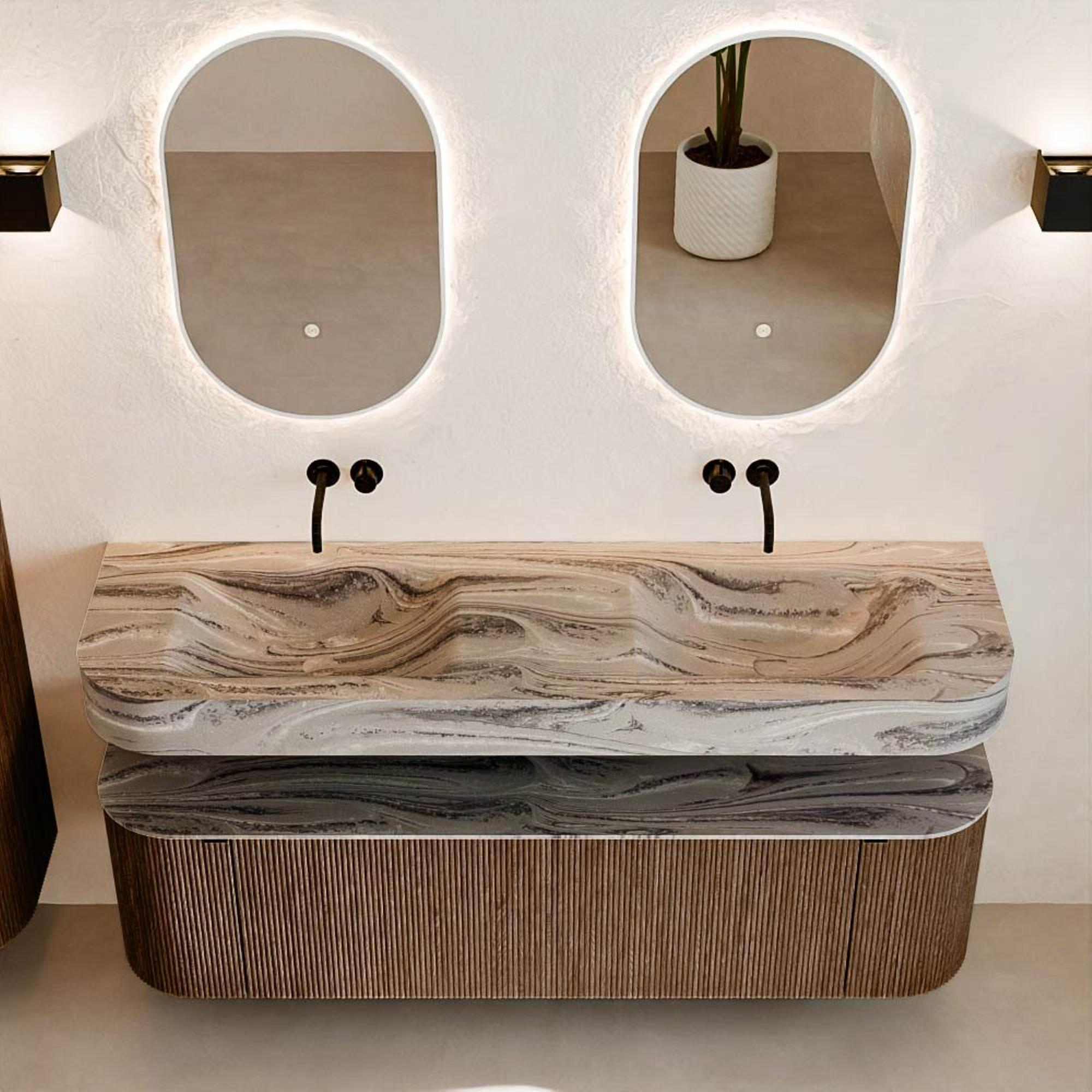 MONDIAZ THOR-DLUX Meuble de salle de bains 160cm arrondi gauche + droite couleur Walnut avec 1 tiroir et 2 portes. Vasque suspendue CLOUD Double sans trou de robinet couleur Sombra.