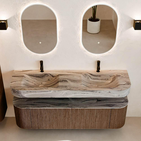 MONDIAZ THOR-DLUX Meuble de salle de bains - 160cm - arrondi gauche + droite - couleur Walnut - 1 tiroir - 2 portes - Vasque suspendue CLOUD Double 2 trous de robinet - couleur Sombra