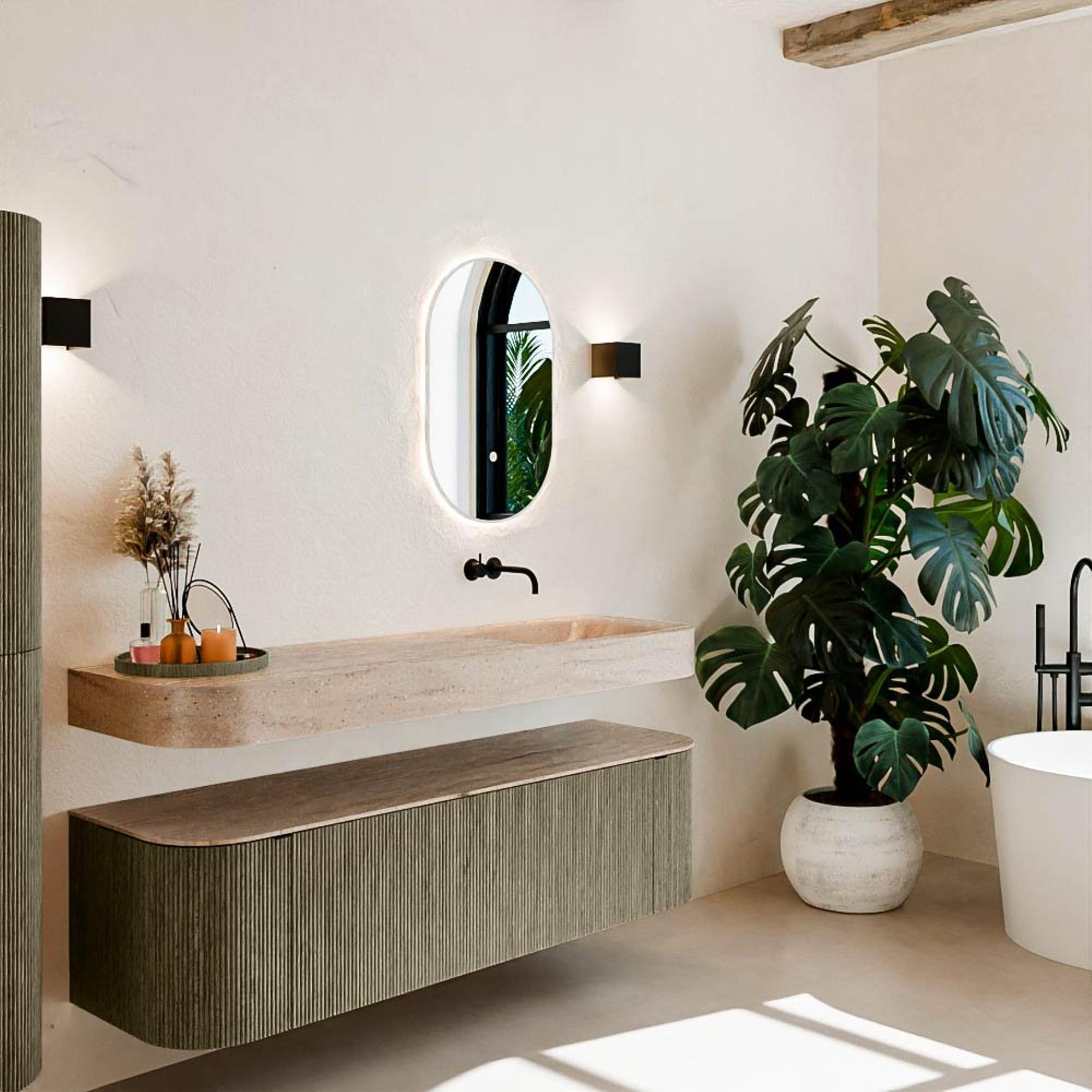 Matériaux naturels dans des tons chauds. Les reliefs verticaux apportent rythme et texture au design, tandis que le chêne confère une apparence chaleureuse et artisanale. Choisissez parmi 5 teintes de bois OAK, WALNUT, DUSK, SHADOW et RUBY, des couleurs de bois soigneusement sélectionnées pour enrichir les salles de bains modernes et classiques.