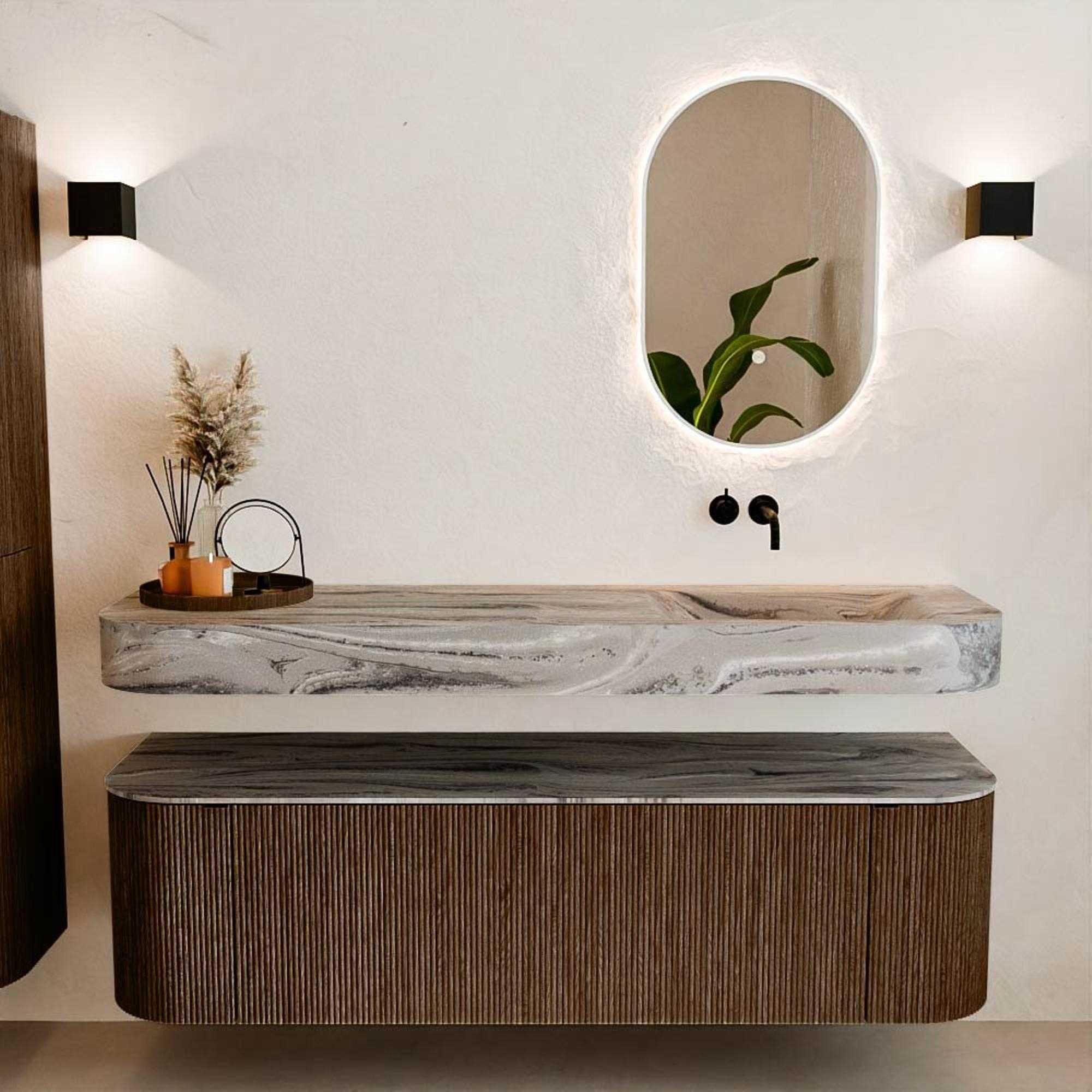Au-dessus du meuble flotte une vasque suspendue assortie aux coins arrondis – parfaitement adaptée à la forme du meuble. La vasque est réalisée en Solid Surface et suit subtilement les lignes du meuble inférieur, créant ainsi un ensemble harmonieux. Le plan de travail en Solid Surface forme une base solide, facile d'entretien, et complète la combinaison.