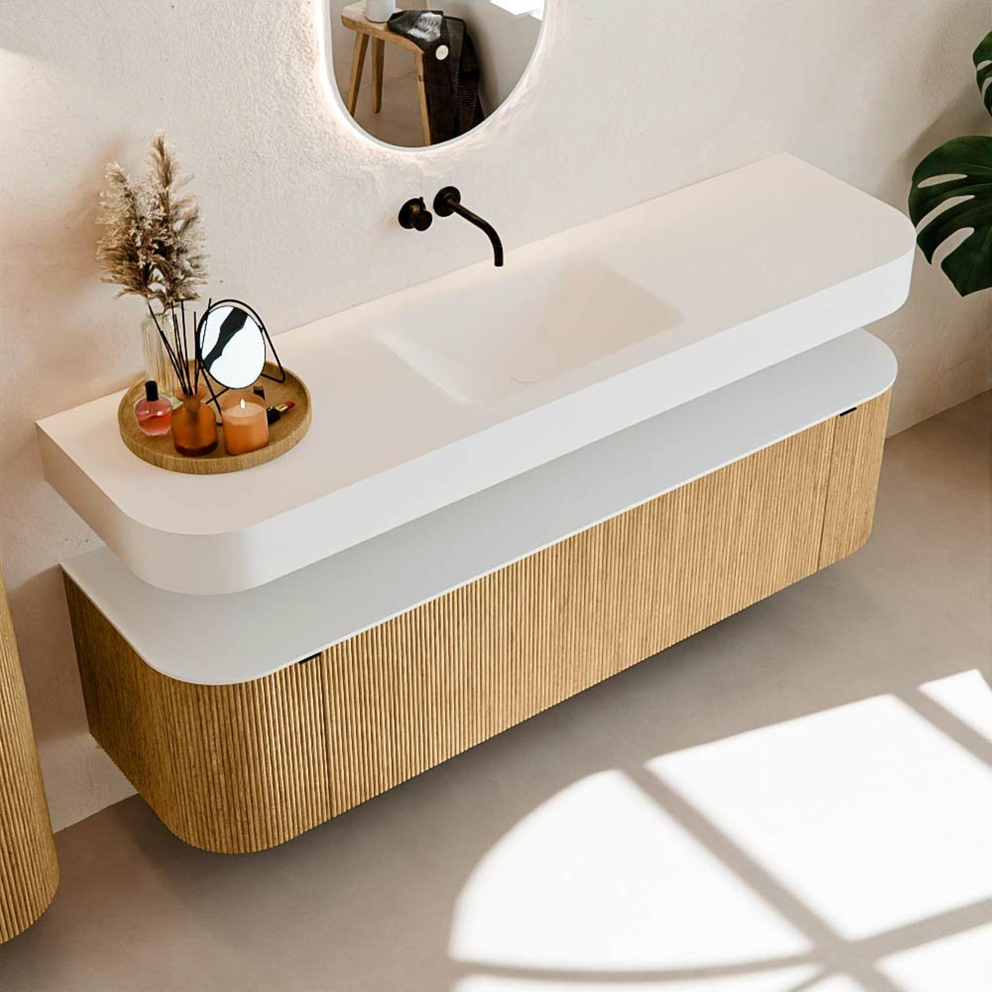Au-dessus du meuble flotte une vasque suspendue assortie aux coins arrondis – parfaitement adaptée à la forme du meuble. La vasque est en Solid Surface et suit subtilement les lignes du meuble inférieur, créant un ensemble harmonieux. Le plan de travail en Solid Surface constitue une base solide et facile d'entretien, complétant la combinaison.