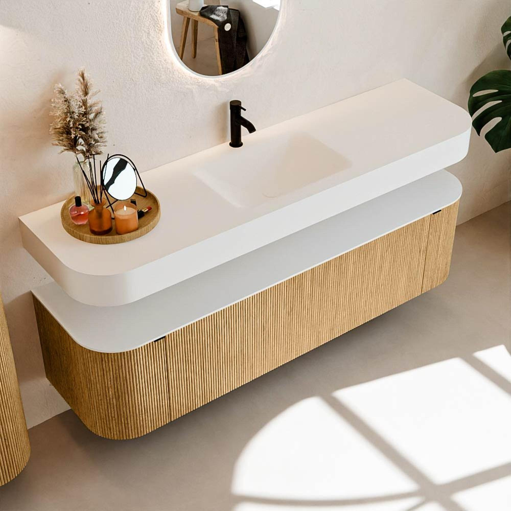 Au-dessus du meuble flotte une vasque suspendue assortie aux coins arrondis – parfaitement adaptée à la forme du meuble. La vasque est en Solid Surface et suit subtilement les lignes du meuble inférieur, créant ainsi un ensemble harmonieux. Le plan de travail en Solid Surface forme une base solide et facile d'entretien et complète la combinaison.