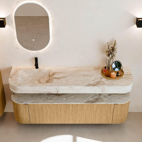 Au-dessus du meuble flotte une vasque suspendue assortie aux coins arrondis – parfaitement adaptée à la forme du meuble. La vasque est réalisée en Solid Surface et suit subtilement les lignes du meuble inférieur, créant un ensemble harmonieux. Le plan de travail en Solid Surface forme une base solide, facile d'entretien et complète la combinaison.