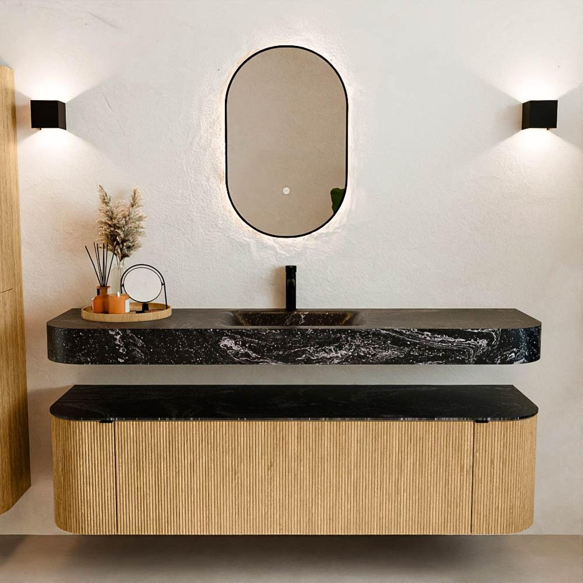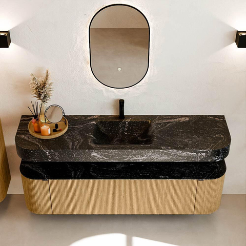 Matériaux naturels dans des tons chauds. Les cannelures verticales apportent rythme et texture au design, tandis que le chêne confère une apparence chaleureuse et artisanale. Choisissez parmi 5 teintes de bois OAK, WALNUT, DUSK, SHADOW et RUBY, des couleurs de bois soigneusement sélectionnées pour enrichir les salles de bains modernes et classiques.