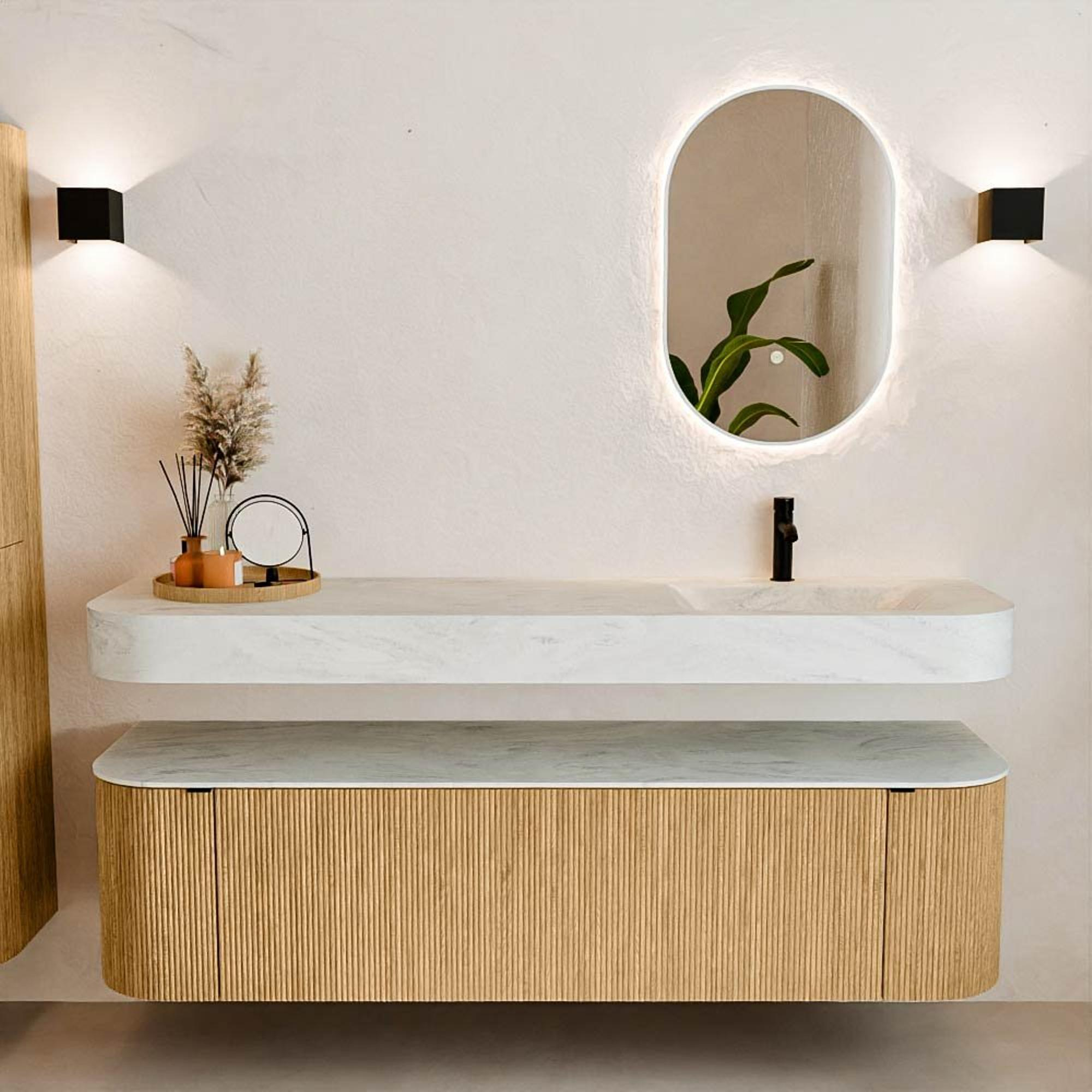 Au-dessus du meuble flotte une vasque suspendue assortie aux coins arrondis – parfaitement adaptée à la forme du meuble. La vasque est réalisée en Solid Surface et suit subtilement les lignes du meuble inférieur, créant ainsi un ensemble harmonieux. Le plan de travail en Solid Surface forme une base solide, facile d'entretien, et complète la combinaison.