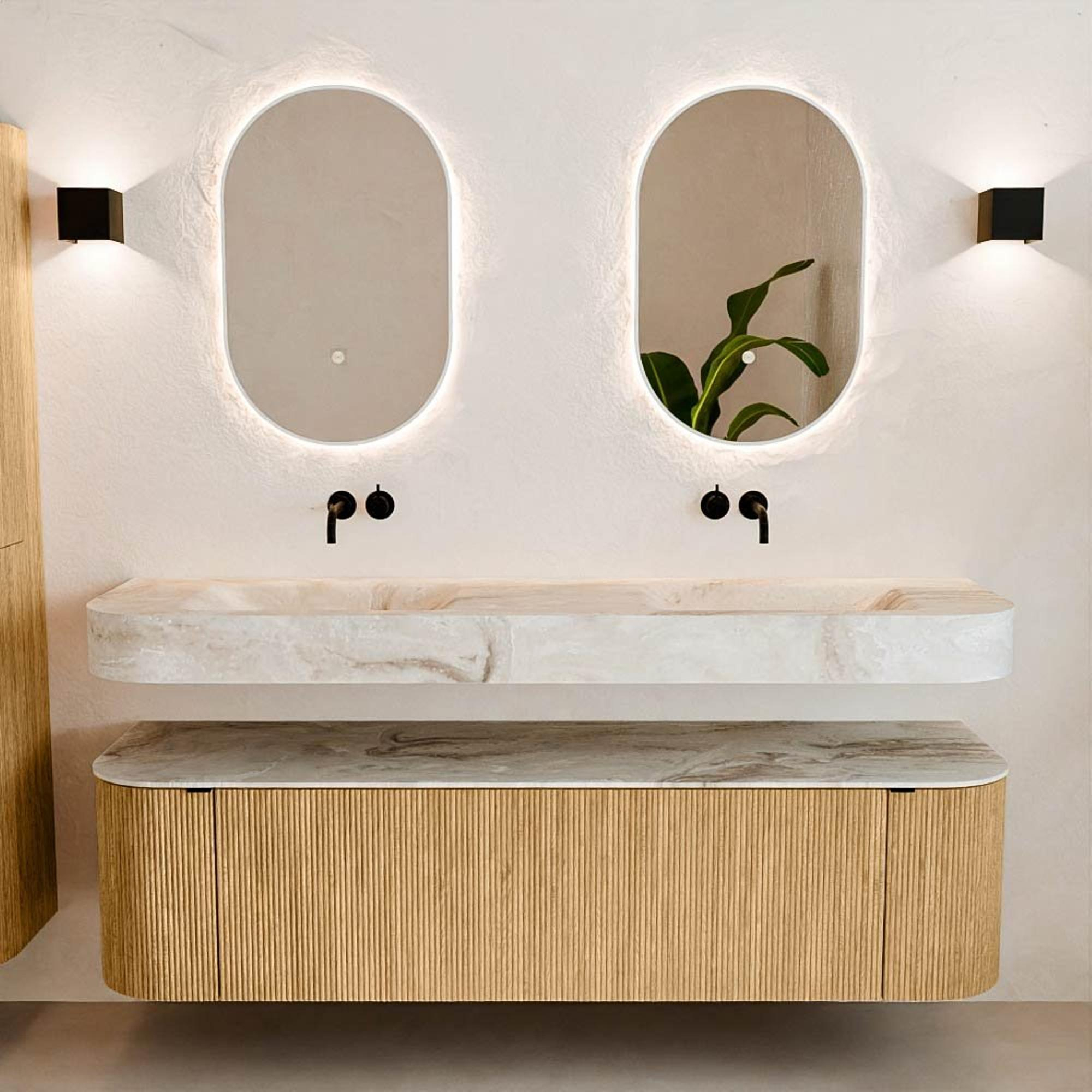 Matériaux naturels dans des tons chauds. Les nervures verticales apportent rythme et texture au design, tandis que le chêne confère une apparence chaleureuse et artisanale. Choisissez parmi 5 teintes de bois OAK, WALNUT, DUSK, SHADOW et RUBY, des couleurs de bois soigneusement sélectionnées pour enrichir les salles de bains modernes et classiques.