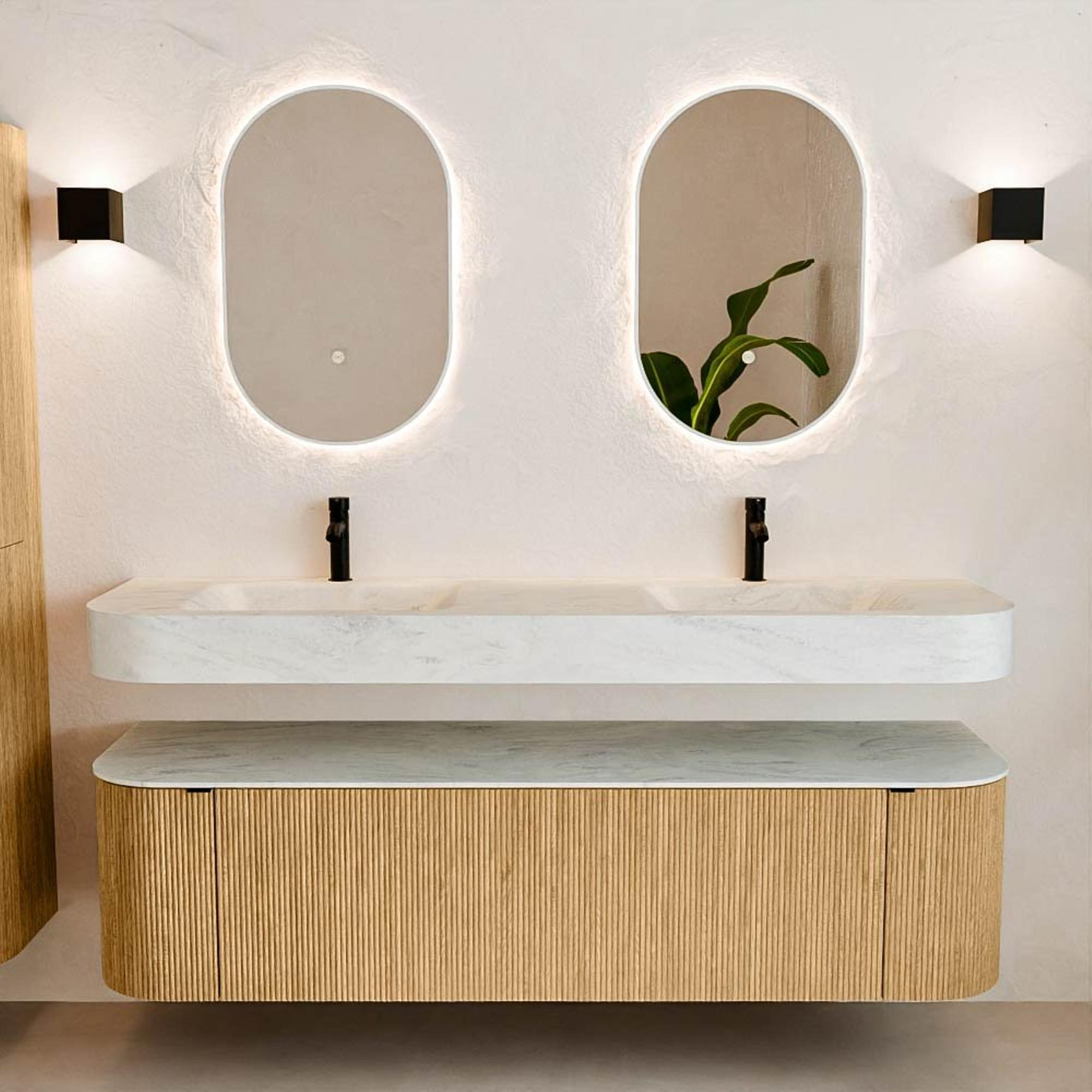 Matériaux naturels dans des tons chauds. Les nervures verticales apportent rythme et texture au design, tandis que le chêne confère une apparence chaleureuse et artisanale. Choisissez parmi 5 teintes de bois OAK, WALNUT, DUSK, SHADOW et RUBY, des couleurs de bois soigneusement sélectionnées pour enrichir les salles de bains modernes et classiques.