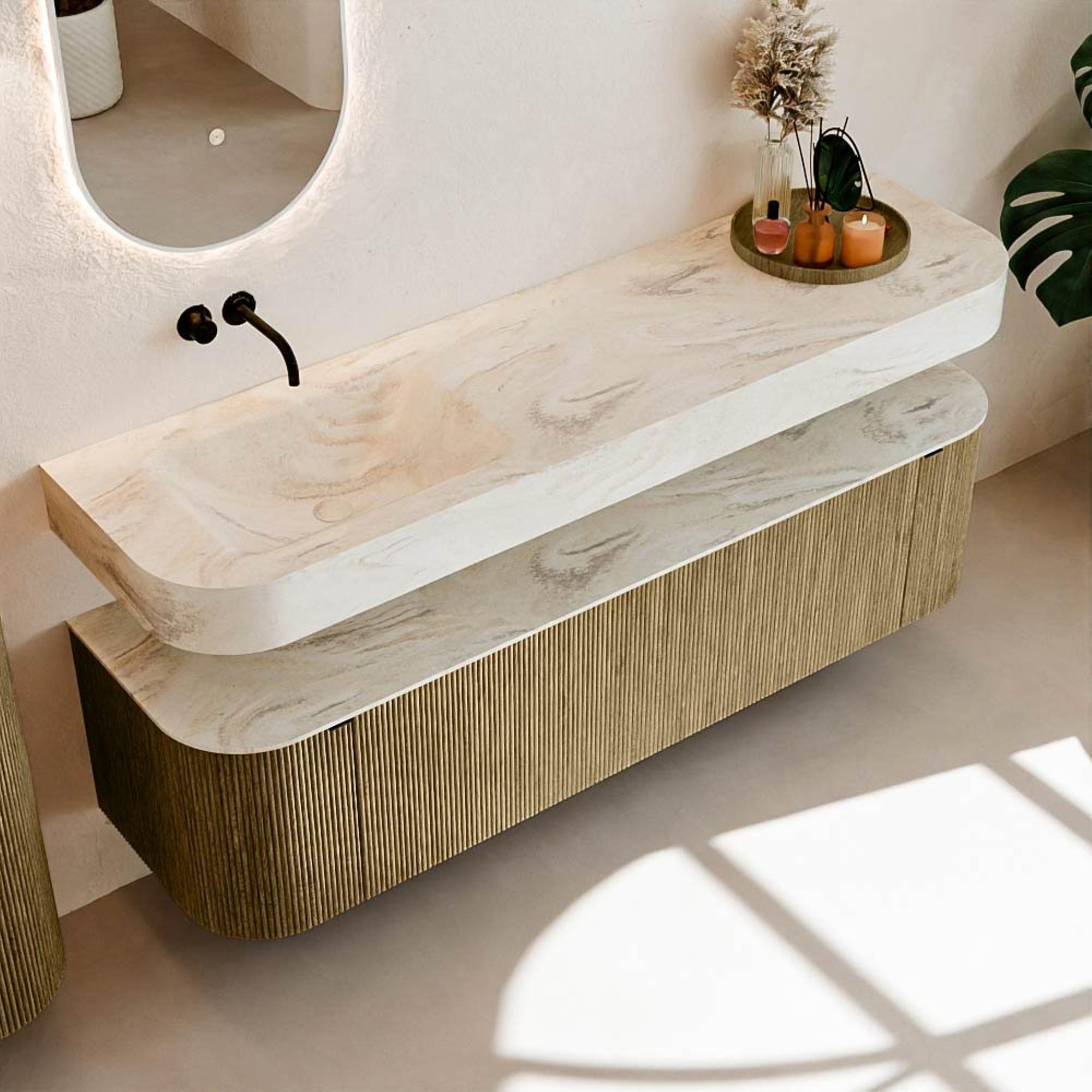 Au-dessus du meuble flotte une vasque suspendue assortie aux coins arrondis – parfaitement adaptée à la forme du meuble. La vasque est en Solid Surface et suit subtilement les lignes du meuble sous-jacent, créant une harmonie parfaite. Le plan de travail en Solid Surface constitue une base solide et facile d'entretien, complétant l'ensemble.