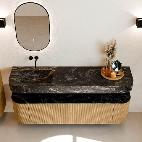 MONDIAZ THOR-DLUX Meuble de salle de bains - 170cm - arrondi gauche + droite - couleur Oak - 1 tiroir et 2 portes - Vasque suspendue CLOUD Gauche sans trou de robinet - couleur Lava