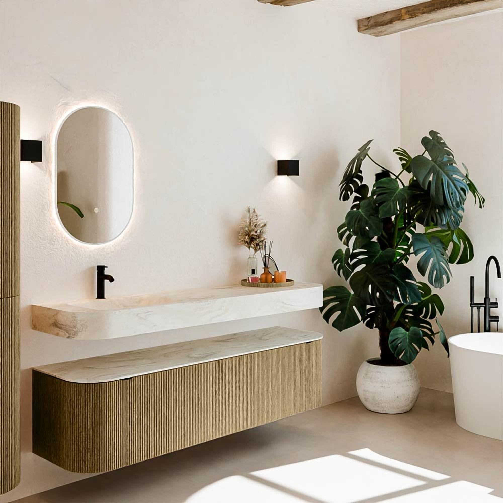 Matériaux naturels dans des tons chauds. Les rainures verticales apportent rythme et texture au design, tandis que le chêne confère une apparence chaleureuse et artisanale. Choisissez parmi 5 teintes de bois OAK, WALNUT, DUSK, SHADOW et RUBY, des couleurs de bois soigneusement sélectionnées pour enrichir les salles de bains modernes et classiques.