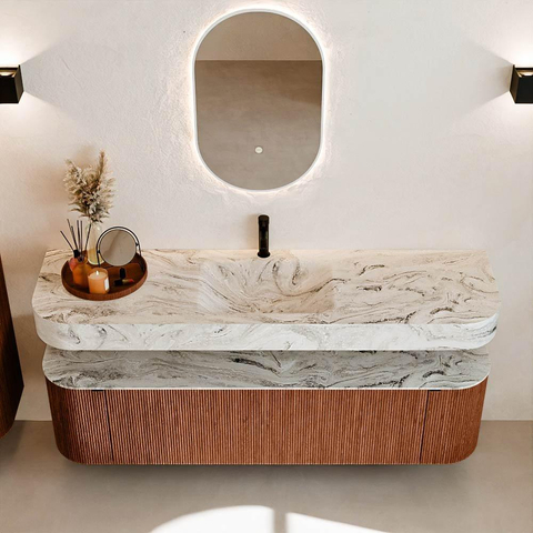 Au-dessus du meuble flotte une vasque suspendue assortie aux coins arrondis – parfaitement adaptée à la forme du meuble. La vasque est réalisée en Solid Surface et suit subtilement les lignes du meuble inférieur, créant ainsi un ensemble harmonieux. Le plan de travail en Solid Surface forme une base solide, facile d'entretien, et complète la combinaison.