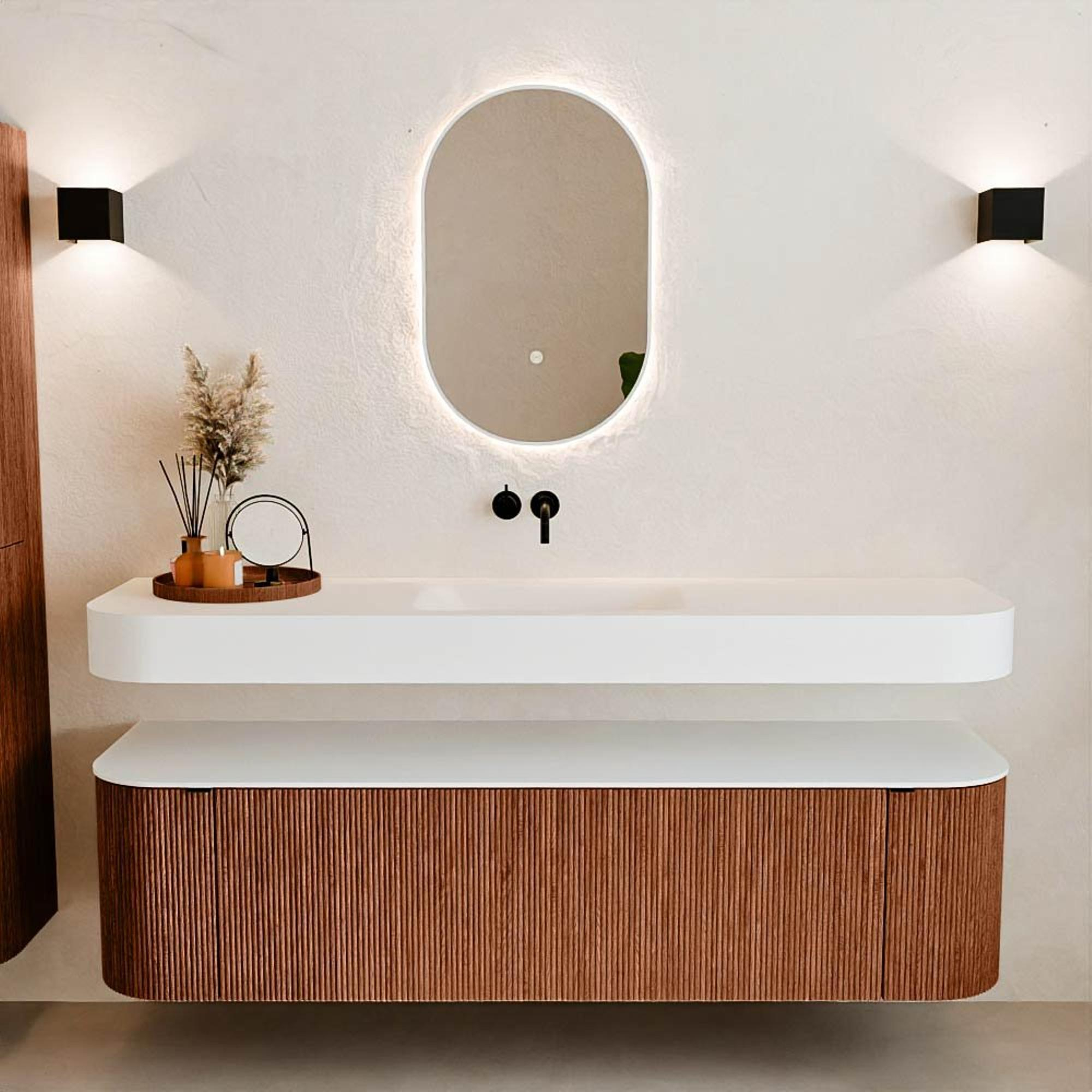 Matériaux naturels aux teintes chaudes. Les cannelures verticales apportent rythme et texture au design, tandis que le chêne confère une apparence chaleureuse et artisanale. Choisissez parmi 5 teintes de bois OAK, WALNUT, DUSK, SHADOW et RUBY, des couleurs de bois soigneusement sélectionnées pour enrichir les salles de bains modernes et classiques.