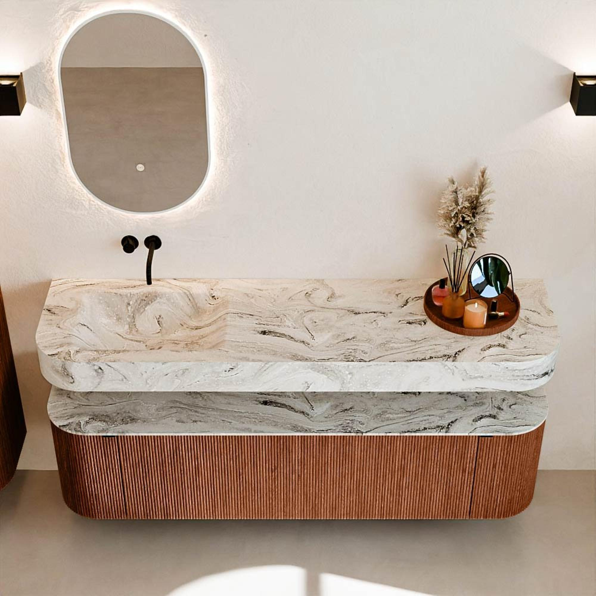 Matériaux naturels aux teintes chaudes. Les cannelures verticales apportent rythme et texture au design, tandis que le chêne confère une apparence chaleureuse et artisanale. Choisissez parmi 5 teintes de bois OAK, WALNUT, DUSK, SHADOW et RUBY, des couleurs de bois soigneusement sélectionnées pour enrichir les salles de bains modernes et classiques.