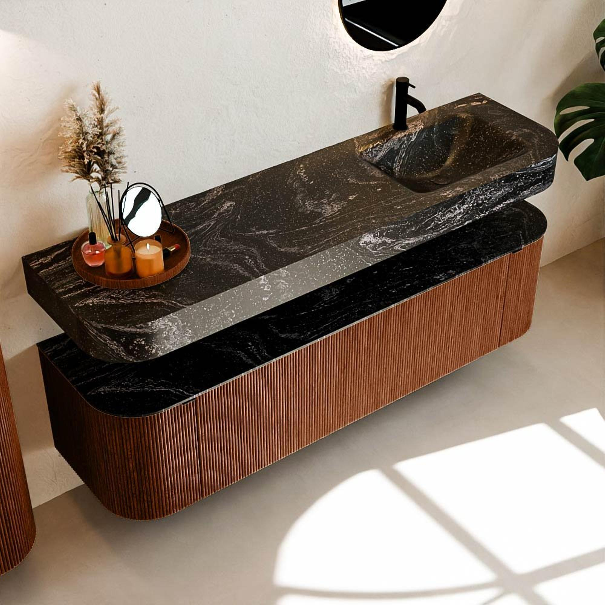 Au-dessus du meuble flotte une vasque suspendue assortie aux coins arrondis – parfaitement adaptée à la forme du meuble. La vasque est réalisée en Solid Surface et suit subtilement les lignes du meuble inférieur, créant ainsi un ensemble harmonieux. Le plan de travail en Solid Surface forme une base solide, facile d'entretien et complète la combinaison.