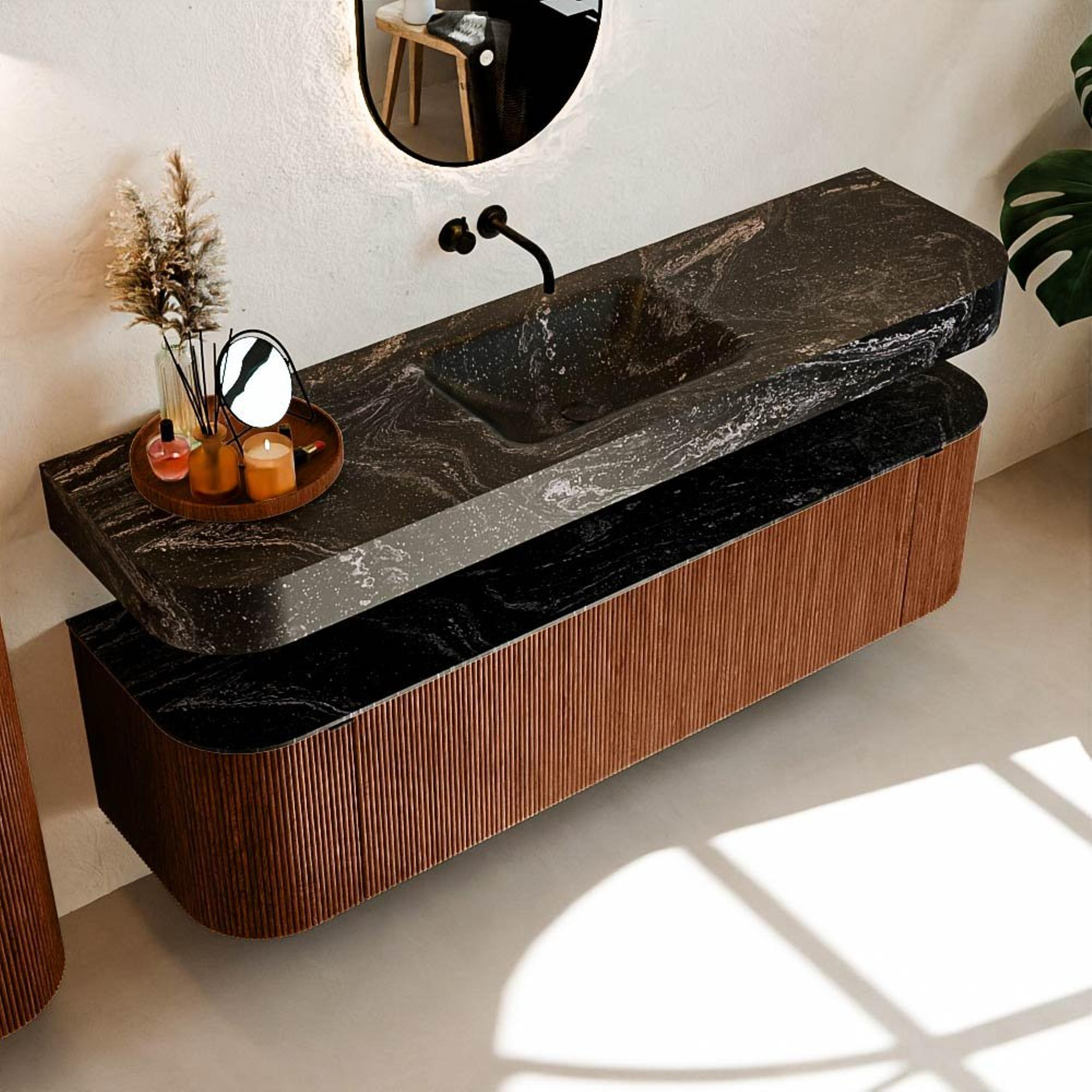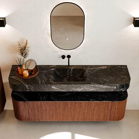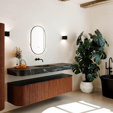 Matériaux naturels dans des tons chauds. Les nervures verticales apportent rythme et texture au design, tandis que le chêne confère une apparence chaleureuse et artisanale. Choisissez parmi 5 teintes de bois OAK, WALNUT, DUSK, SHADOW et RUBY, des couleurs de bois soigneusement sélectionnées pour enrichir les salles de bains modernes et classiques.