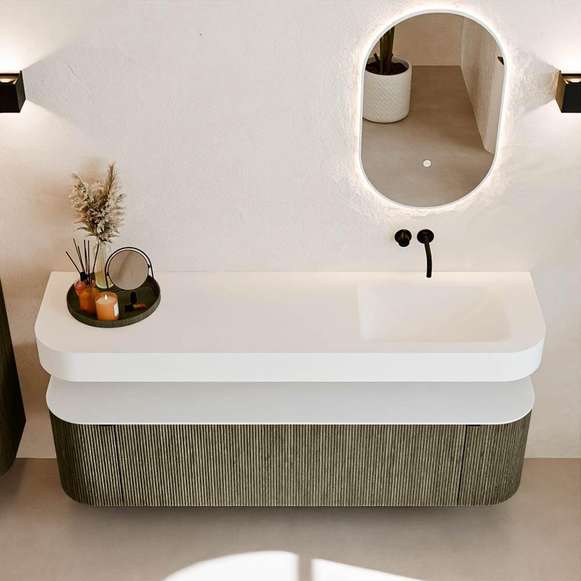 Au-dessus du meuble flotte une vasque suspendue assortie aux coins arrondis – parfaitement adaptée à la forme du meuble. La vasque est réalisée en Solid Surface et suit subtilement les lignes du meuble inférieur, créant ainsi un ensemble harmonieux. Le plan de travail en Solid Surface constitue une base solide et facile d'entretien et complète la combinaison.