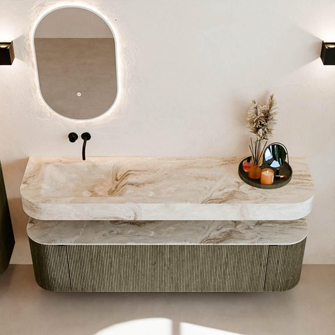 Au-dessus du meuble flotte une vasque suspendue assortie aux coins arrondis – parfaitement adaptée à la forme du meuble. La vasque est réalisée en Solid Surface et suit subtilement les lignes du meuble inférieur, créant ainsi un ensemble harmonieux. Le plan de travail en Solid Surface constitue une base solide et facile d'entretien et complète la combinaison.