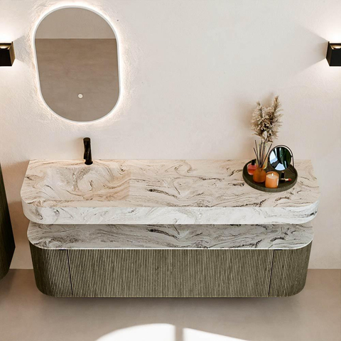 Au-dessus du meuble flotte une vasque suspendue assortie aux coins arrondis – parfaitement adaptée à la forme du meuble. La vasque est réalisée en Solid Surface et suit subtilement les lignes du meuble inférieur, créant un ensemble harmonieux. Le plan de travail en Solid Surface forme une base solide et facile d’entretien et complète la combinaison.