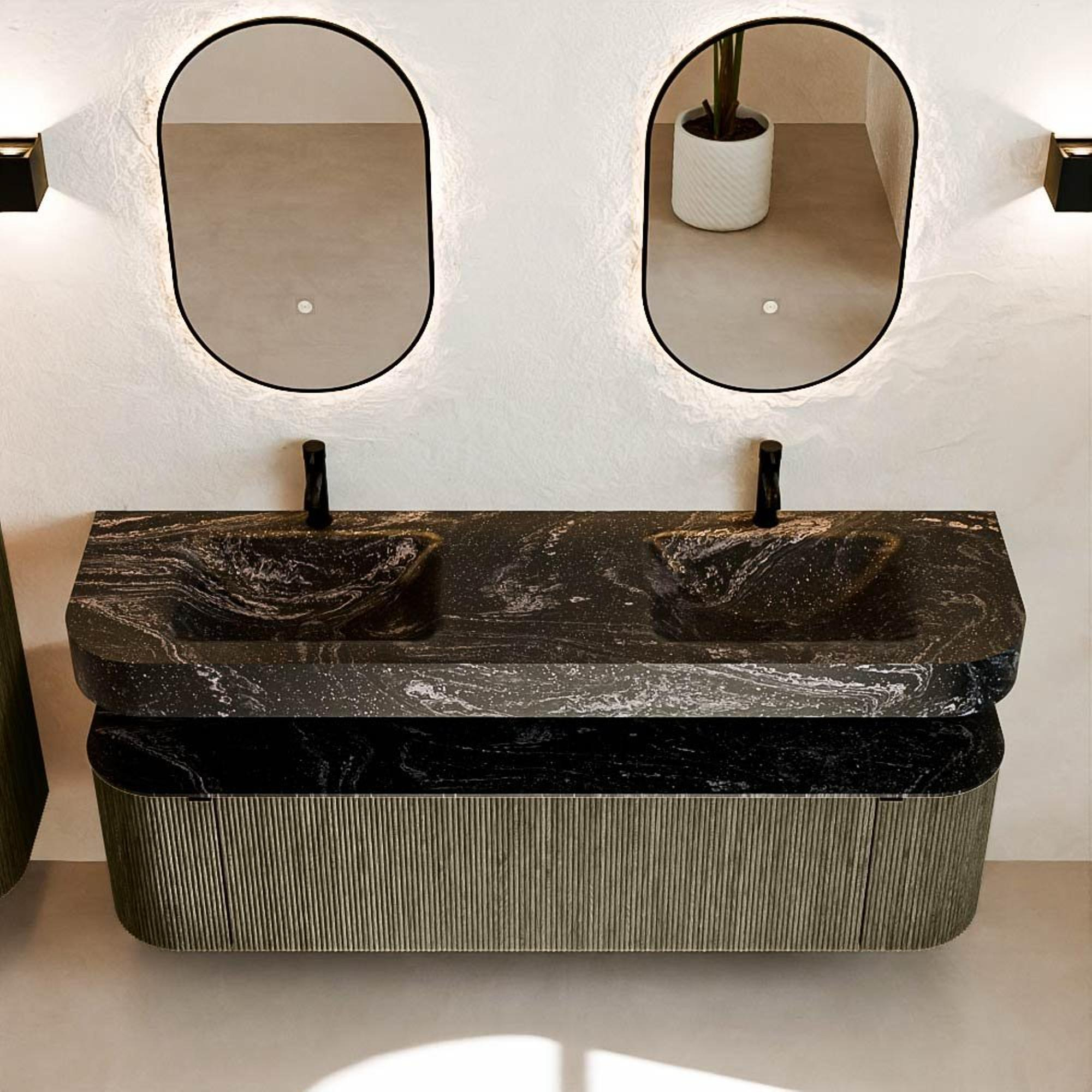 MONDIAZ THOR-DLUX Meuble de salle de bains - 170cm - arrondi gauche + droite - couleur Shadow - 1 tiroir et 2 portes - Vasque suspendue CLOUD Double 2 trous de robinet - couleur Lava
