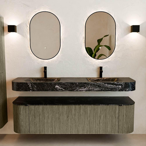 Matériaux naturels dans des tons chauds. Les nervures verticales apportent rythme et texture au design, tandis que le chêne confère une apparence chaleureuse et artisanale. Choisissez parmi 5 teintes de bois OAK, WALNUT, DUSK, SHADOW et RUBY, des couleurs de bois soigneusement sélectionnées pour enrichir les salles de bains modernes et classiques.