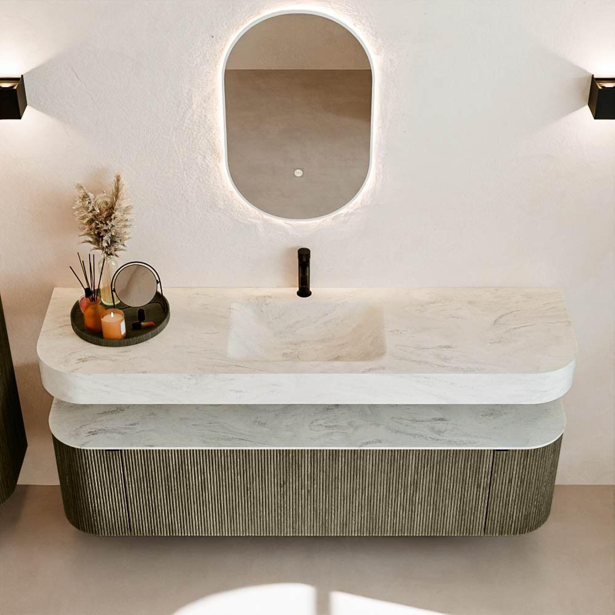 Au-dessus du meuble flotte une vasque suspendue assortie aux coins arrondis – parfaitement adaptée à la forme du meuble. La vasque est réalisée en Solid Surface et suit subtilement les lignes du meuble inférieur, créant ainsi un ensemble harmonieux. Le plan de travail en Solid Surface constitue une base solide et facile d'entretien, complétant la combinaison.