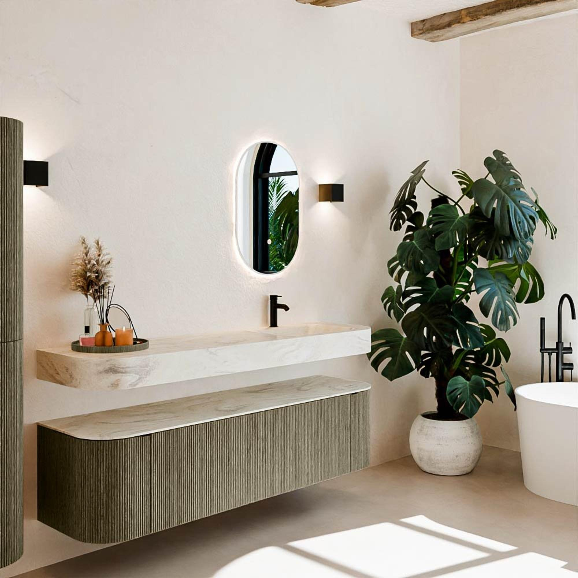 Matériaux naturels dans des tons chauds. Les nervures verticales apportent rythme et texture au design, tandis que le chêne confère une apparence chaleureuse et artisanale. Choisissez parmi 5 teintes de bois OAK, WALNUT, DUSK, SHADOW et RUBY, des couleurs de bois soigneusement sélectionnées pour enrichir les salles de bains modernes et classiques.