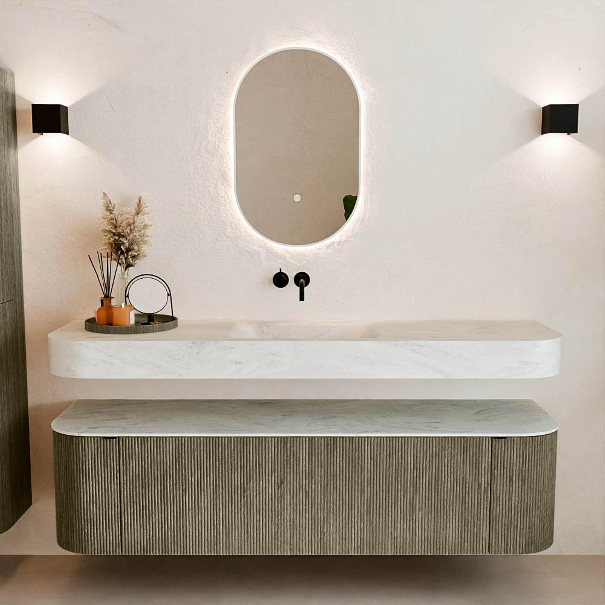 Matériaux naturels dans des tons chauds. Les cannelures verticales apportent rythme et texture au design, tandis que le chêne confère une apparence chaleureuse et artisanale. Choisissez parmi 5 teintes de bois OAK, WALNUT, DUSK, SHADOW et RUBY, des couleurs de bois soigneusement sélectionnées pour enrichir les salles de bains modernes et classiques.
