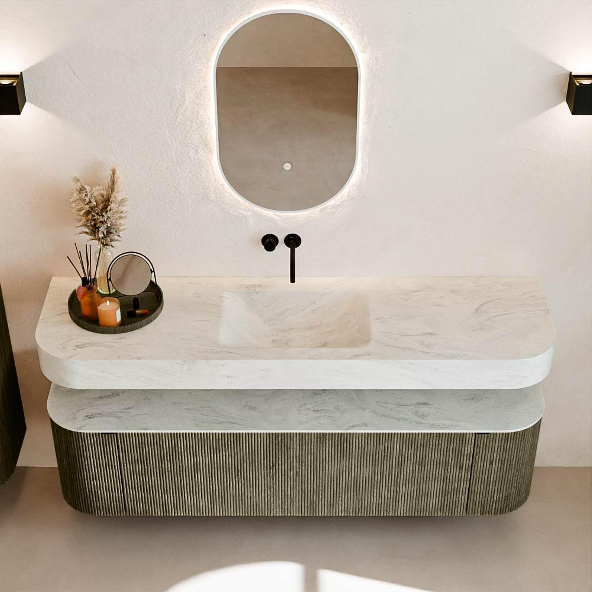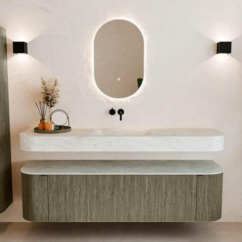 Au-dessus du meuble flotte une vasque suspendue assortie avec des coins arrondis – parfaitement adaptée à la forme du meuble. La vasque est réalisée en Solid Surface et suit subtilement les lignes du meuble inférieur, créant ainsi un ensemble harmonieux. Le plan de travail en Solid Surface forme une base solide, facile d'entretien et complète la combinaison.