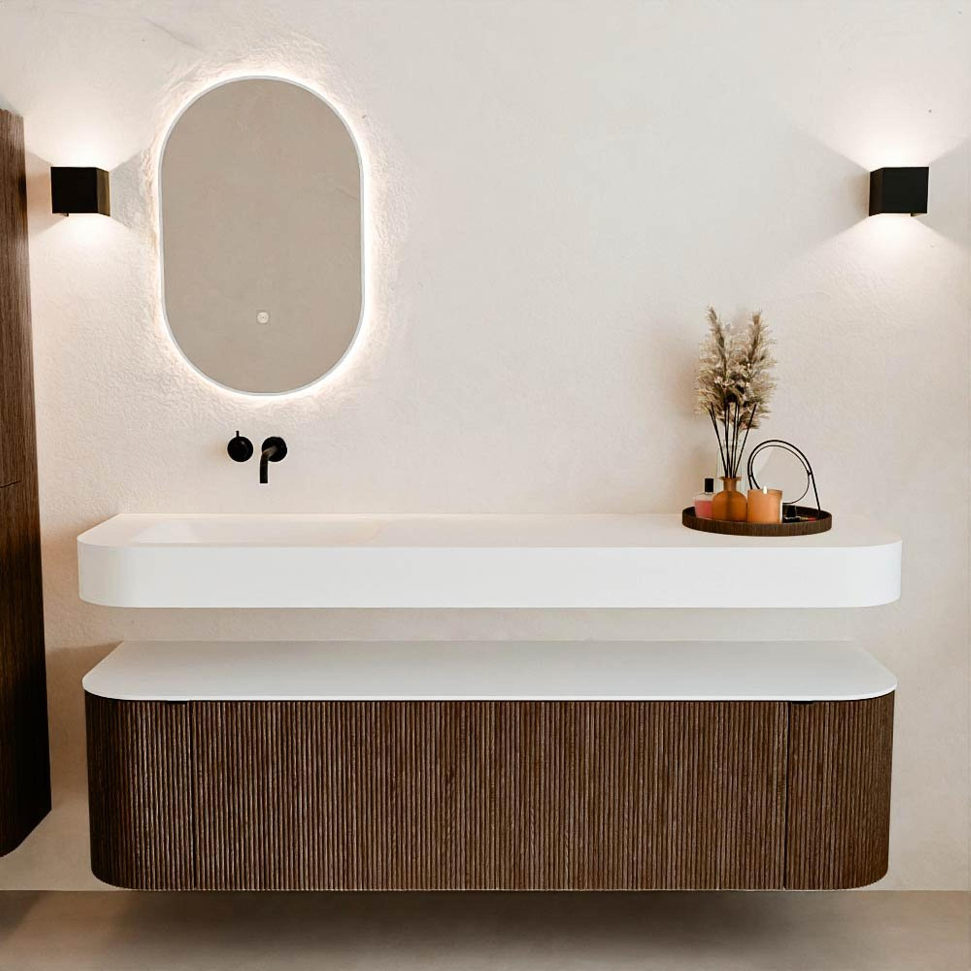 Au-dessus du meuble flotte une vasque suspendue assortie aux coins arrondis – parfaitement adaptée à la forme du meuble. La vasque est en Solid Surface et suit subtilement les lignes du meuble inférieur, créant un ensemble harmonieux. Le plan de travail en Solid Surface constitue une base solide et facile d'entretien, complétant la combinaison.