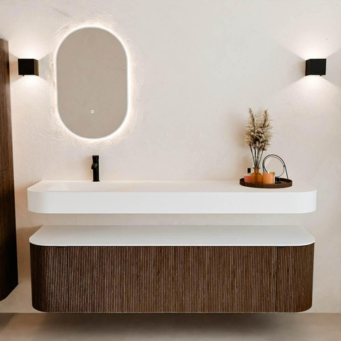 Matériaux naturels dans des tons chauds. Les cannelures verticales apportent rythme et texture au design, tandis que le chêne confère une apparence chaleureuse et artisanale. Choisissez parmi 5 teintes de bois OAK, WALNUT, DUSK, SHADOW et RUBY, des couleurs de bois soigneusement sélectionnées pour enrichir les salles de bains modernes et classiques.