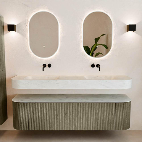 Matériaux naturels aux teintes chaudes. Les reliefs verticaux apportent rythme et texture au design, tandis que le chêne confère une apparence chaleureuse et artisanale. Choisissez parmi 5 teintes de bois OAK, WALNUT, DUSK, SHADOW et RUBY, des couleurs de bois soigneusement sélectionnées pour enrichir les salles de bains modernes et classiques.