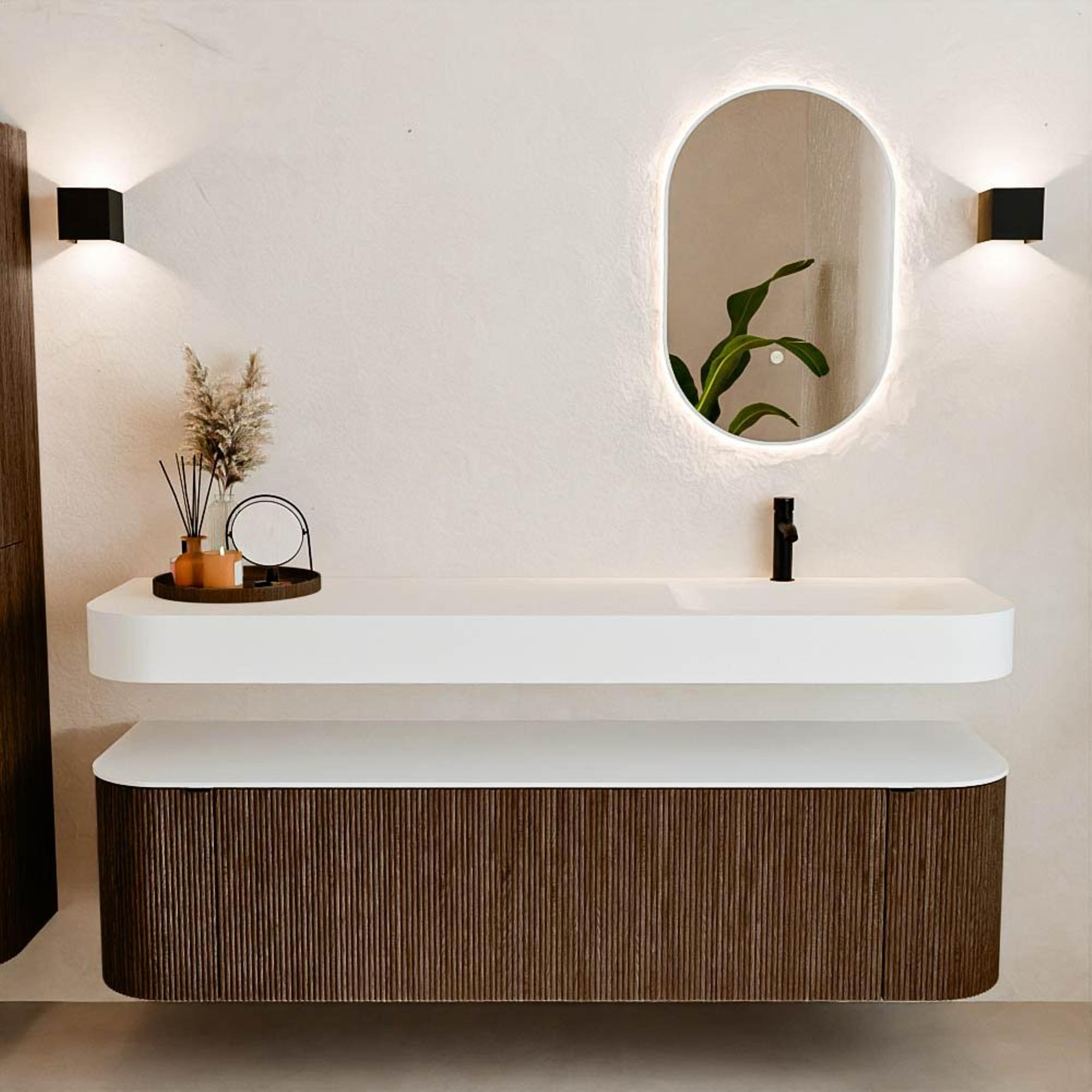 Au-dessus du meuble flotte une vasque suspendue assortie aux coins arrondis – parfaitement adaptée à la forme du meuble. La vasque est réalisée en Solid Surface et suit subtilement les lignes du meuble inférieur, créant ainsi un ensemble harmonieux. Le plan de travail en Solid Surface constitue une base solide et facile d'entretien, complétant la combinaison.
