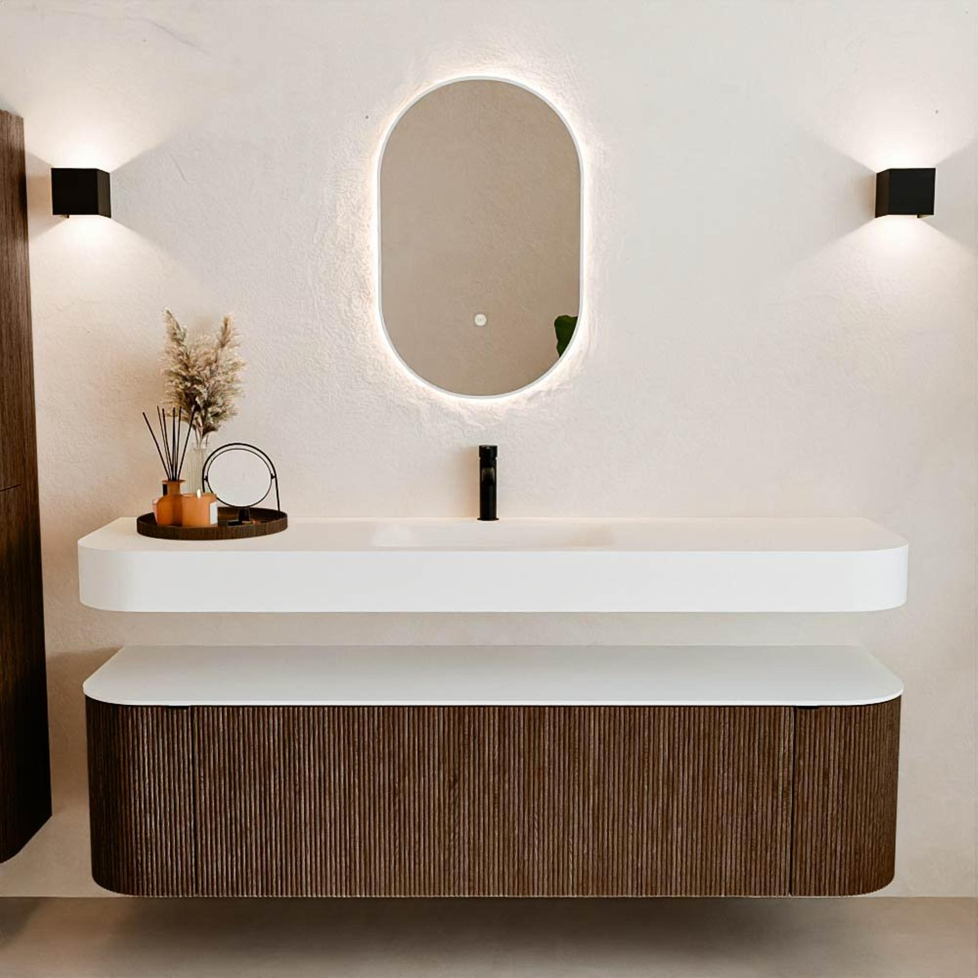 Matériaux naturels dans des tons chauds. Les nervures verticales apportent rythme et texture au design, tandis que le chêne confère une apparence chaleureuse et artisanale. Choisissez parmi 5 teintes de bois OAK, WALNUT, DUSK, SHADOW et RUBY, des couleurs de bois soigneusement sélectionnées pour enrichir les salles de bains modernes et classiques.