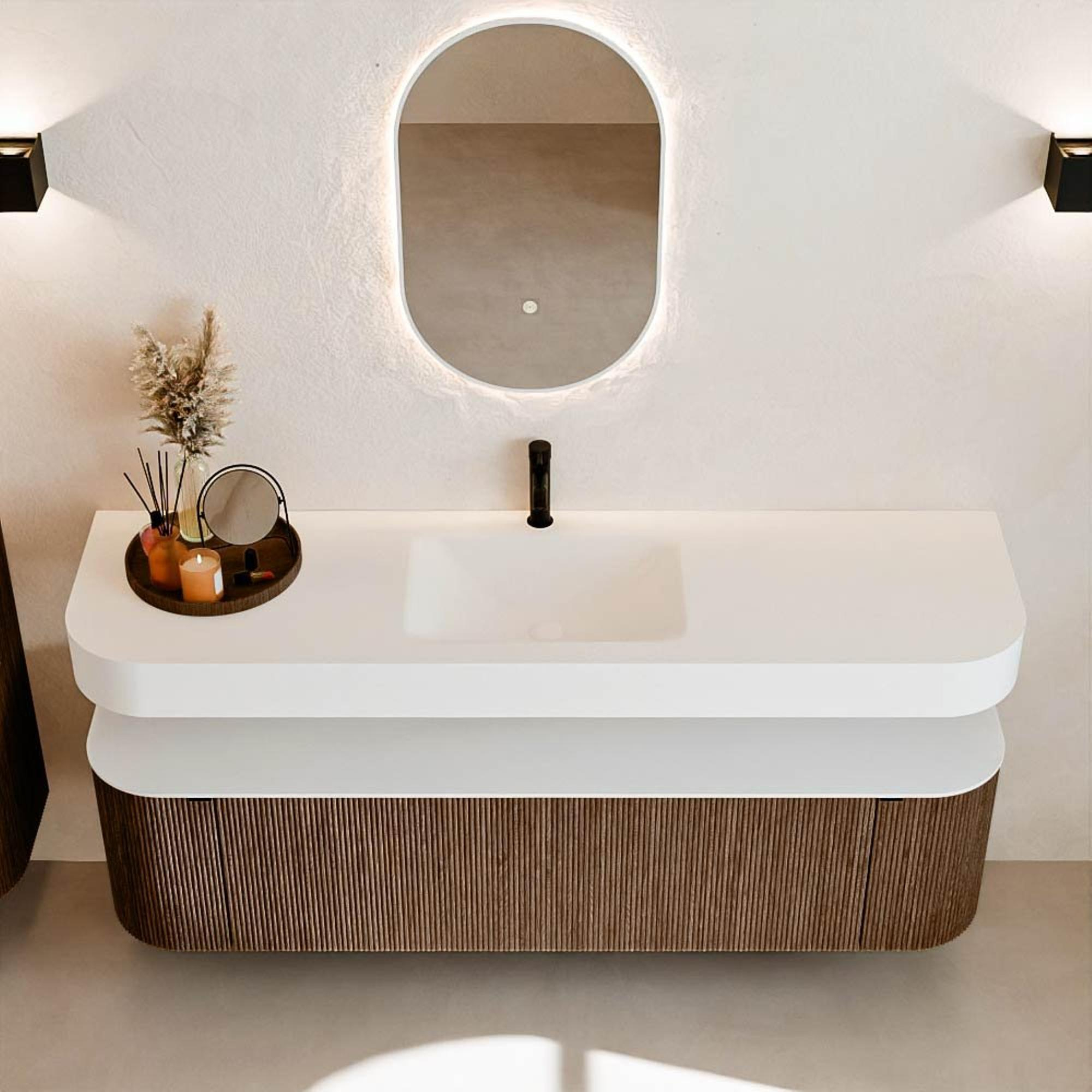 Au-dessus du meuble flotte une vasque suspendue assortie aux coins arrondis – parfaitement adaptée à la forme du meuble. La vasque est réalisée en Solid Surface et suit subtilement les lignes du meuble inférieur, créant ainsi un ensemble harmonieux. Le plan de travail en Solid Surface constitue une base solide, facile d'entretien et complète la combinaison.