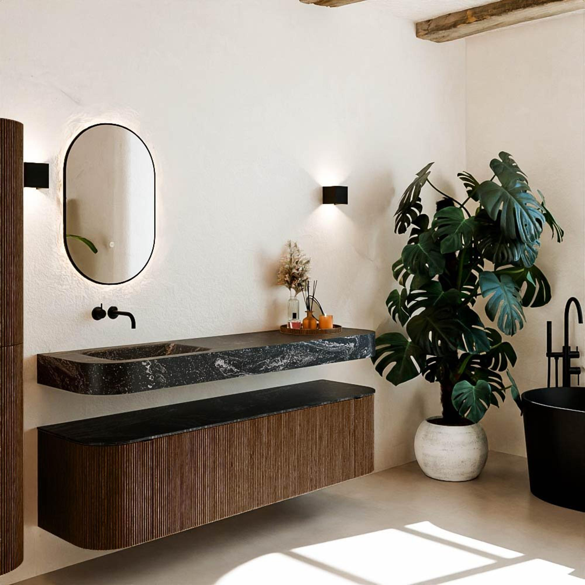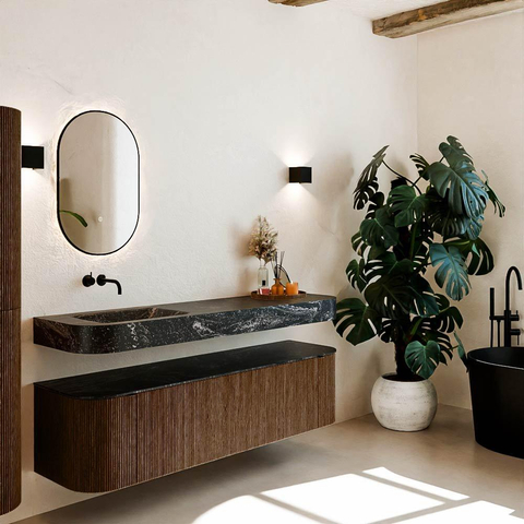 Matériaux naturels dans des tons chauds. Les nervures verticales apportent rythme et texture au design, tandis que le chêne confère une apparence chaleureuse et artisanale. Choisissez parmi 5 teintes de bois OAK, WALNUT, DUSK, SHADOW et RUBY, des couleurs de bois soigneusement sélectionnées pour enrichir les salles de bains modernes et classiques.