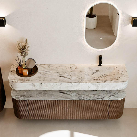 MONDIAZ THOR-DLUX 170cm meuble de salle de bains arrondi gauche + droite couleur Walnut avec 1 tiroir et 2 portes. Vasque suspendue CLOUD Droite 1 trou de robinet couleur Glace.