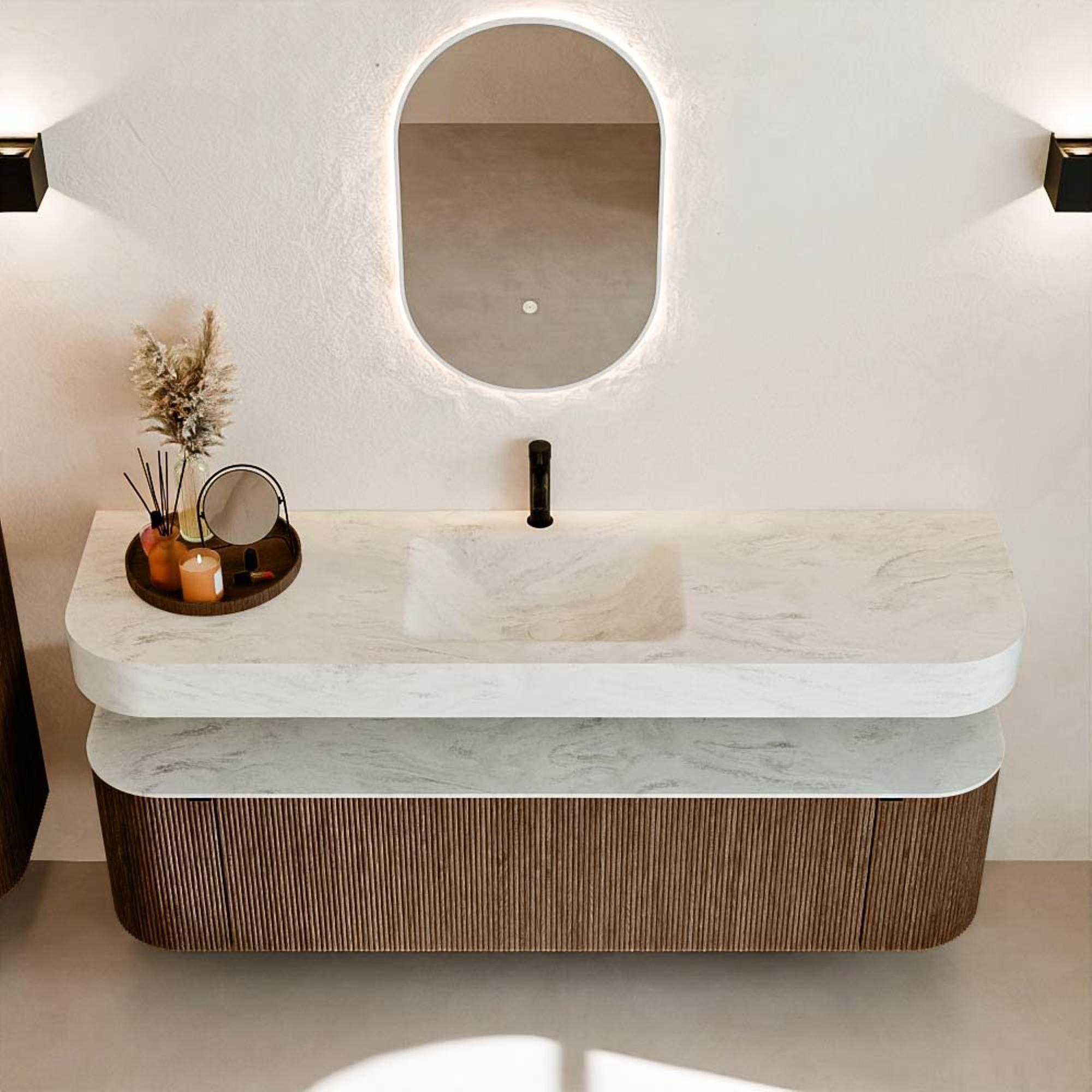 Au-dessus du meuble flotte une vasque suspendue assortie aux coins arrondis – parfaitement adaptée à la forme du meuble. La vasque est réalisée en Solid Surface et suit subtilement les lignes du meuble inférieur, créant ainsi un ensemble harmonieux. Le plan de travail en Solid Surface constitue une base solide et facile d'entretien, complétant la combinaison.