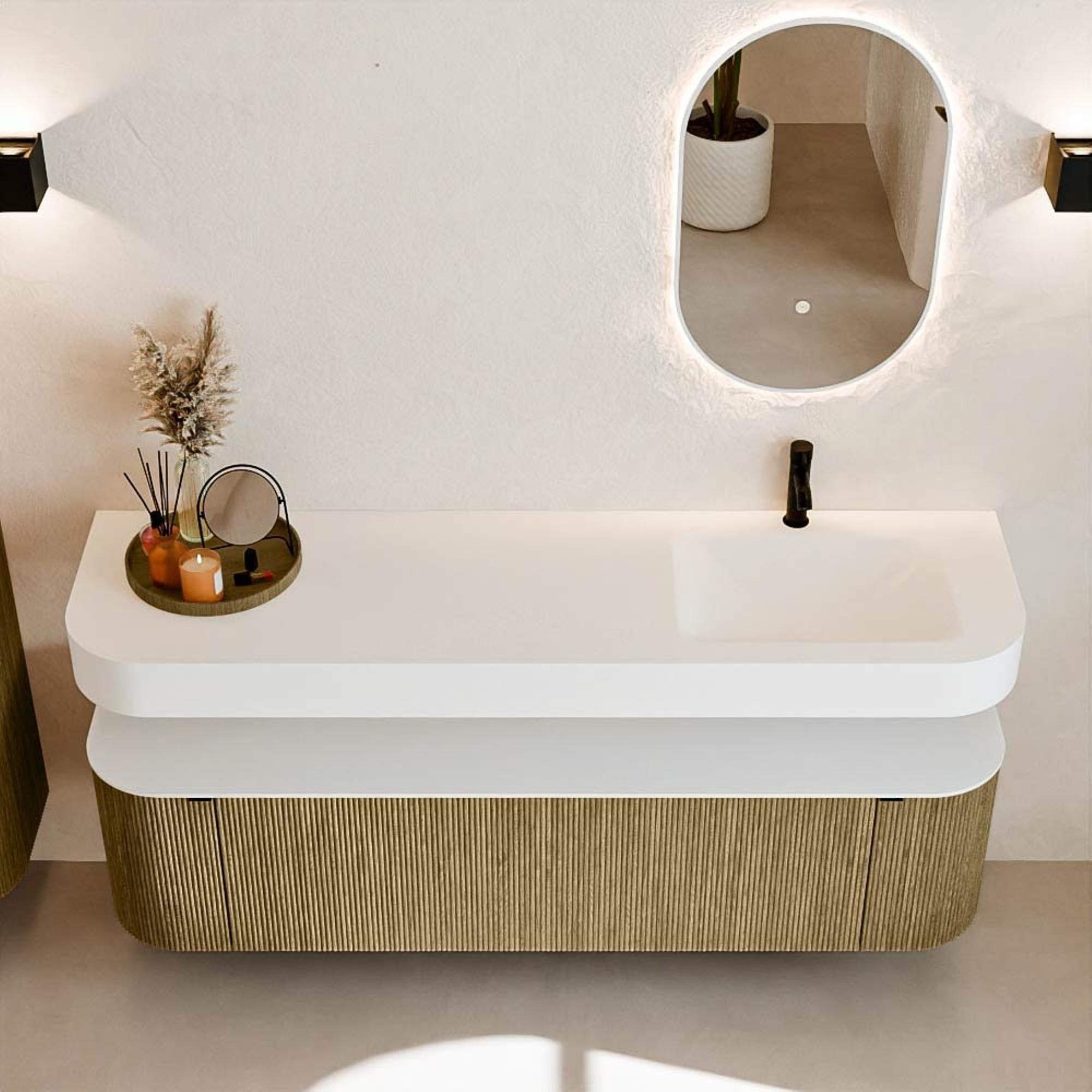Au-dessus du meuble flotte une vasque suspendue assortie aux coins arrondis – parfaitement adaptée à la forme du meuble. La vasque est réalisée en Solid Surface et suit subtilement les lignes du meuble inférieur, créant ainsi un ensemble harmonieux. Le plan de travail en Solid Surface forme une base solide, facile d'entretien et complète la combinaison.