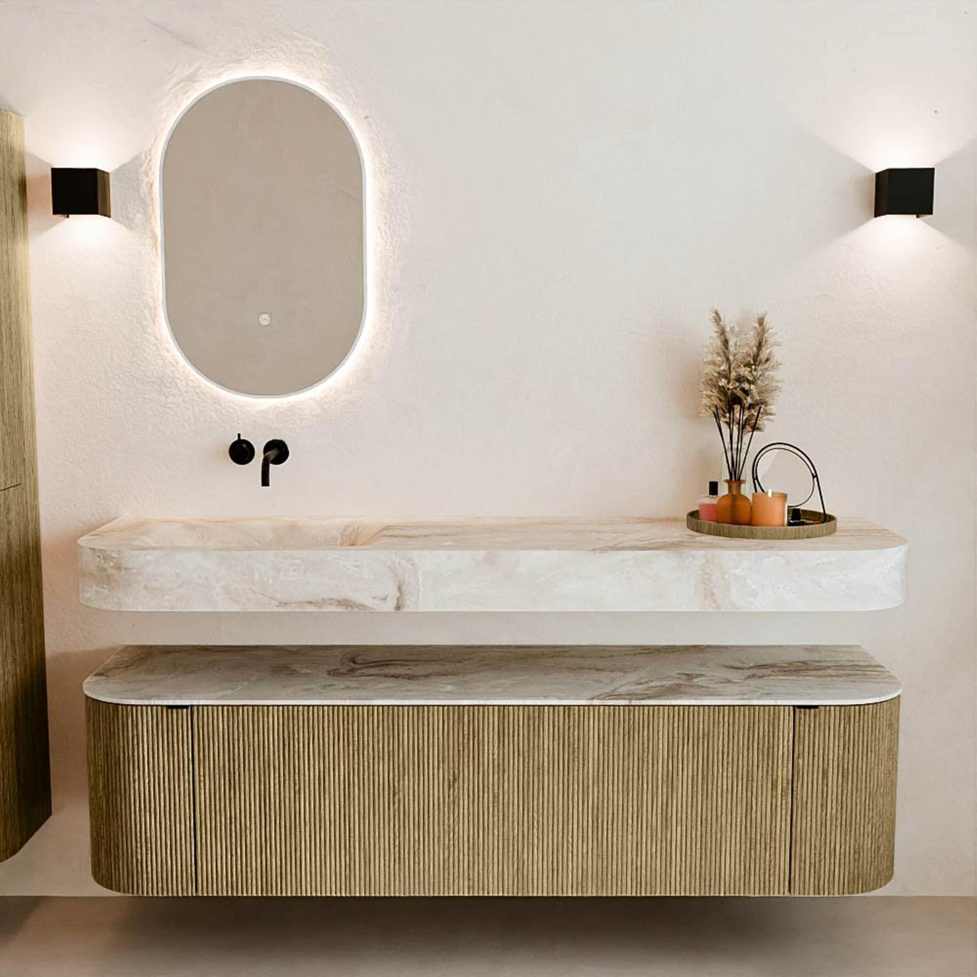 Matériaux naturels dans des tons chauds. Les nervures verticales apportent rythme et texture au design, tandis que le chêne confère une apparence chaleureuse et artisanale. Choisissez parmi 5 teintes de bois OAK, WALNUT, DUSK, SHADOW et RUBY, des couleurs de bois soigneusement sélectionnées pour enrichir les salles de bains modernes et classiques.