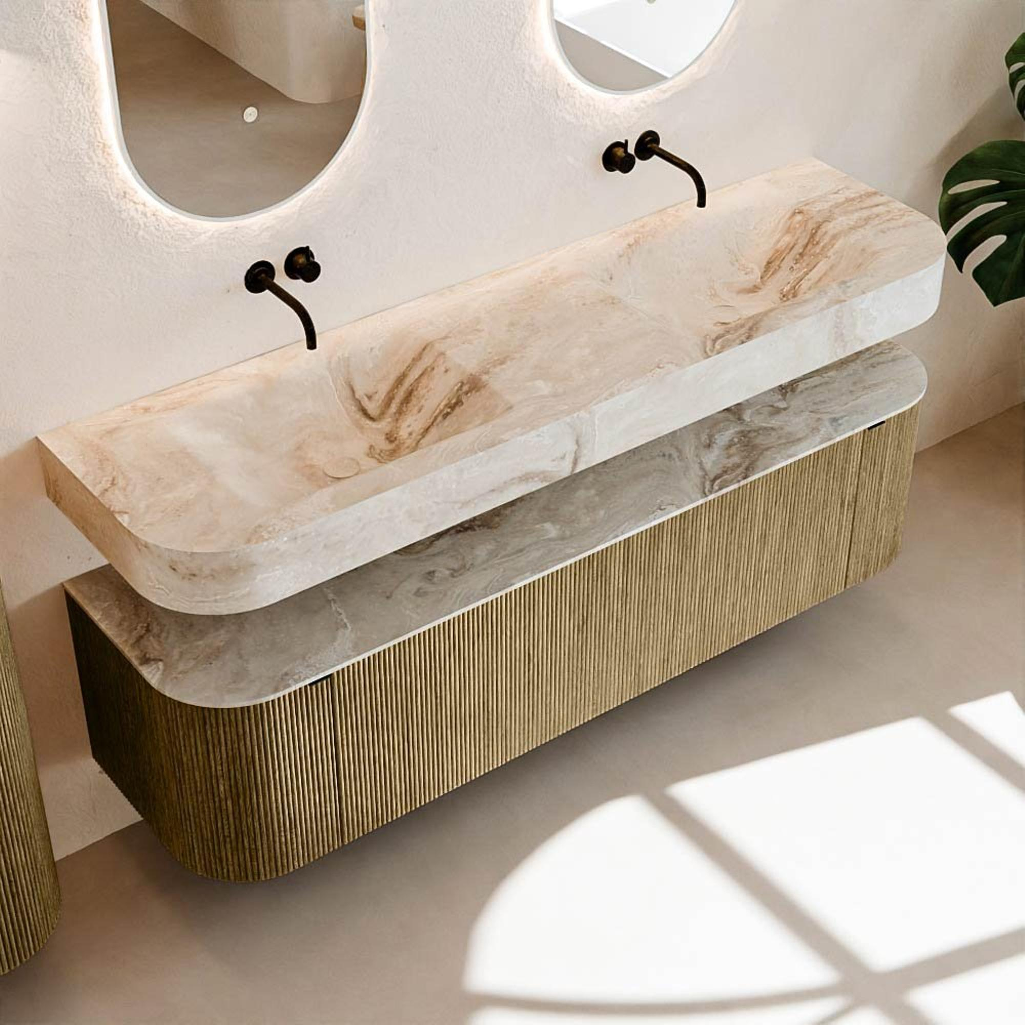Au-dessus du meuble flotte une vasque suspendue assortie aux coins arrondis – parfaitement adaptée à la forme du meuble. La vasque est réalisée en Solid Surface et suit subtilement les lignes du meuble inférieur, créant ainsi un ensemble harmonieux. Le plan de travail en Solid Surface forme une base solide, facile d'entretien, et complète la combinaison.