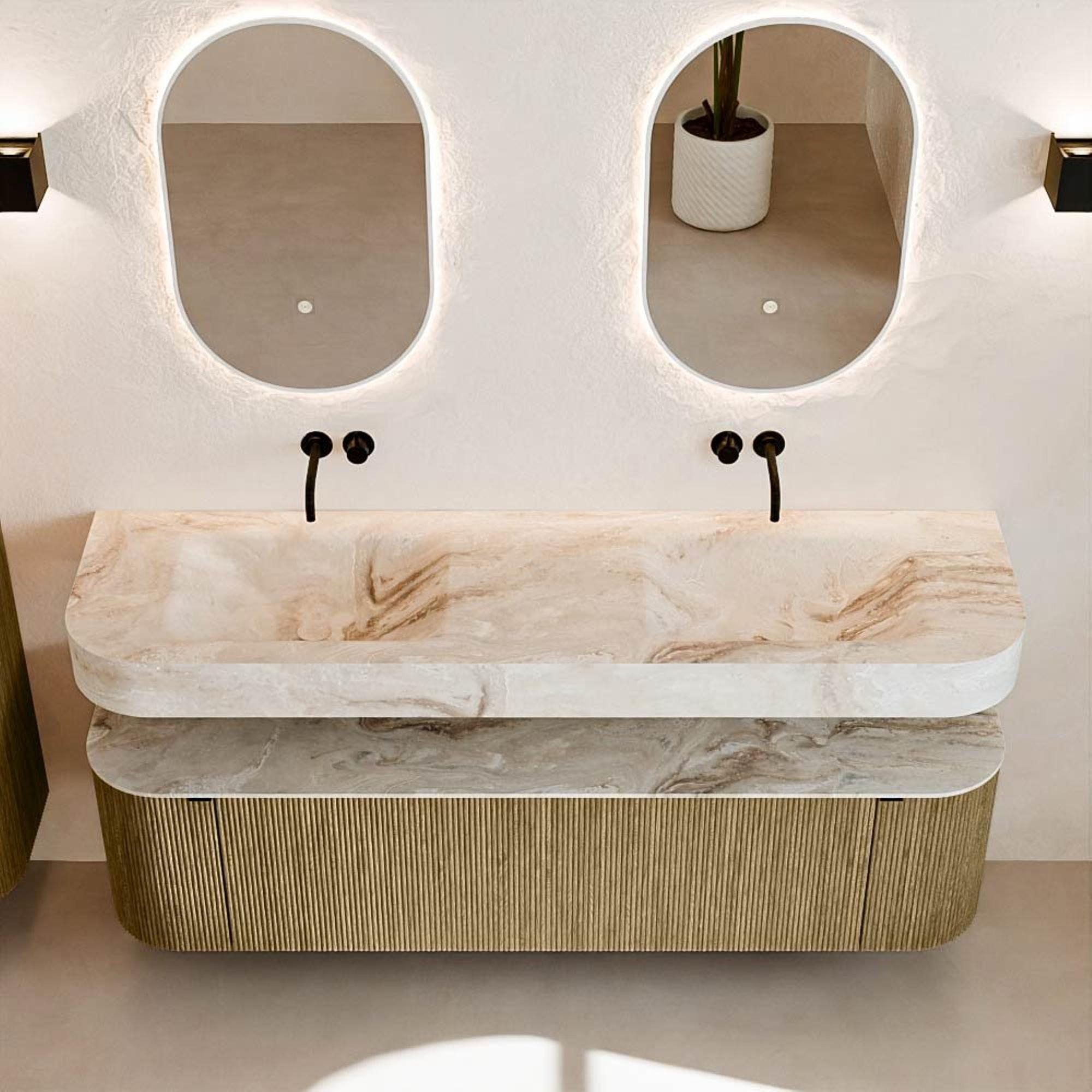 Matériaux naturels dans des tons chauds. Les nervures verticales apportent rythme et texture au design, tandis que le chêne confère une apparence chaleureuse et artisanale. Choisissez parmi 5 teintes de bois OAK, WALNUT, DUSK, SHADOW et RUBY, des couleurs de bois soigneusement sélectionnées pour enrichir les salles de bains modernes et classiques.
