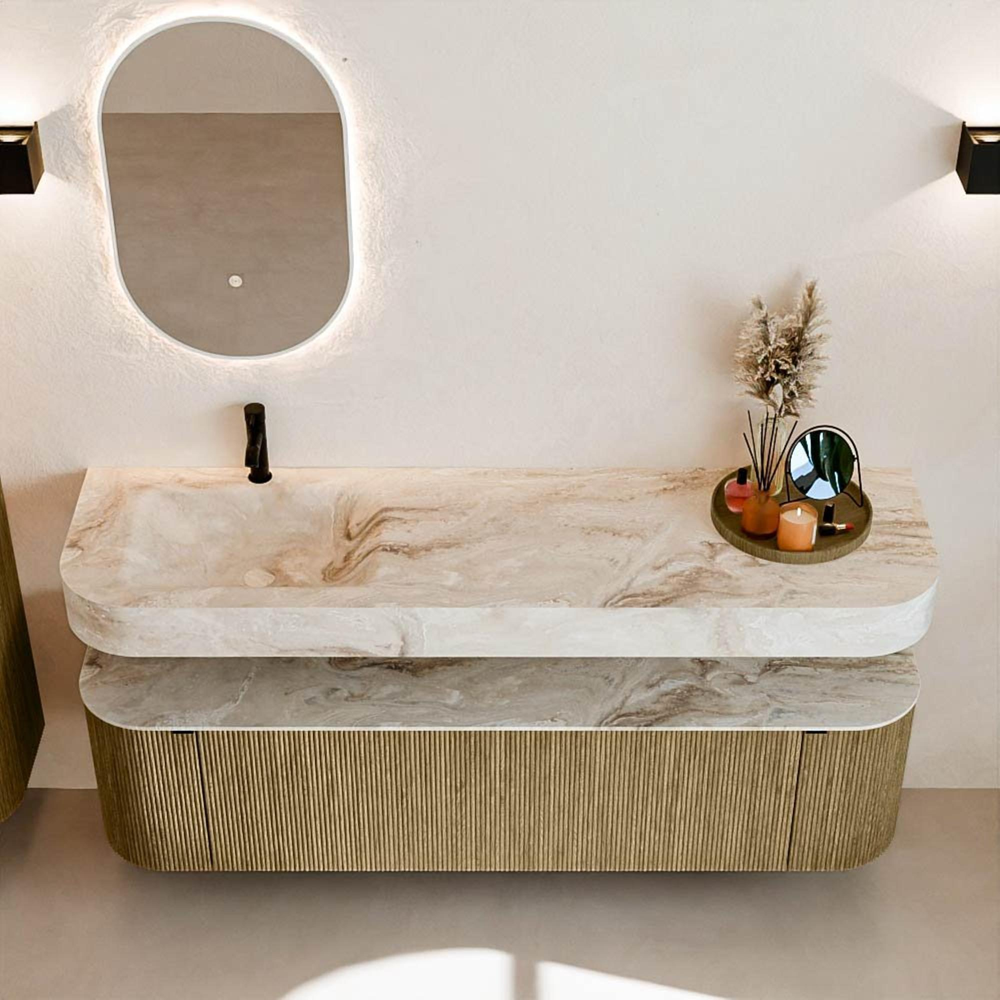 Matériaux naturels dans des tons chauds. Les nervures verticales apportent rythme et texture au design, tandis que le chêne confère une apparence chaleureuse et artisanale. Choisissez parmi 5 teintes de bois OAK, WALNUT, DUSK, SHADOW et RUBY, des couleurs de bois soigneusement sélectionnées pour enrichir les salles de bains modernes et classiques.