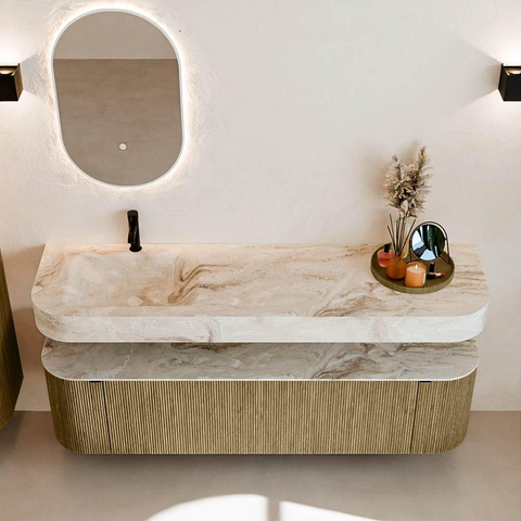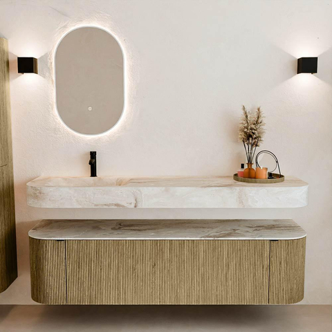 Au-dessus du meuble flotte une vasque suspendue assortie aux coins arrondis – parfaitement adaptée à la forme du meuble. La vasque est réalisée en Solid Surface et suit subtilement les lignes du meuble inférieur, créant ainsi un ensemble harmonieux. Le plan de travail en Solid Surface constitue une base solide, facile d'entretien et complète la combinaison.